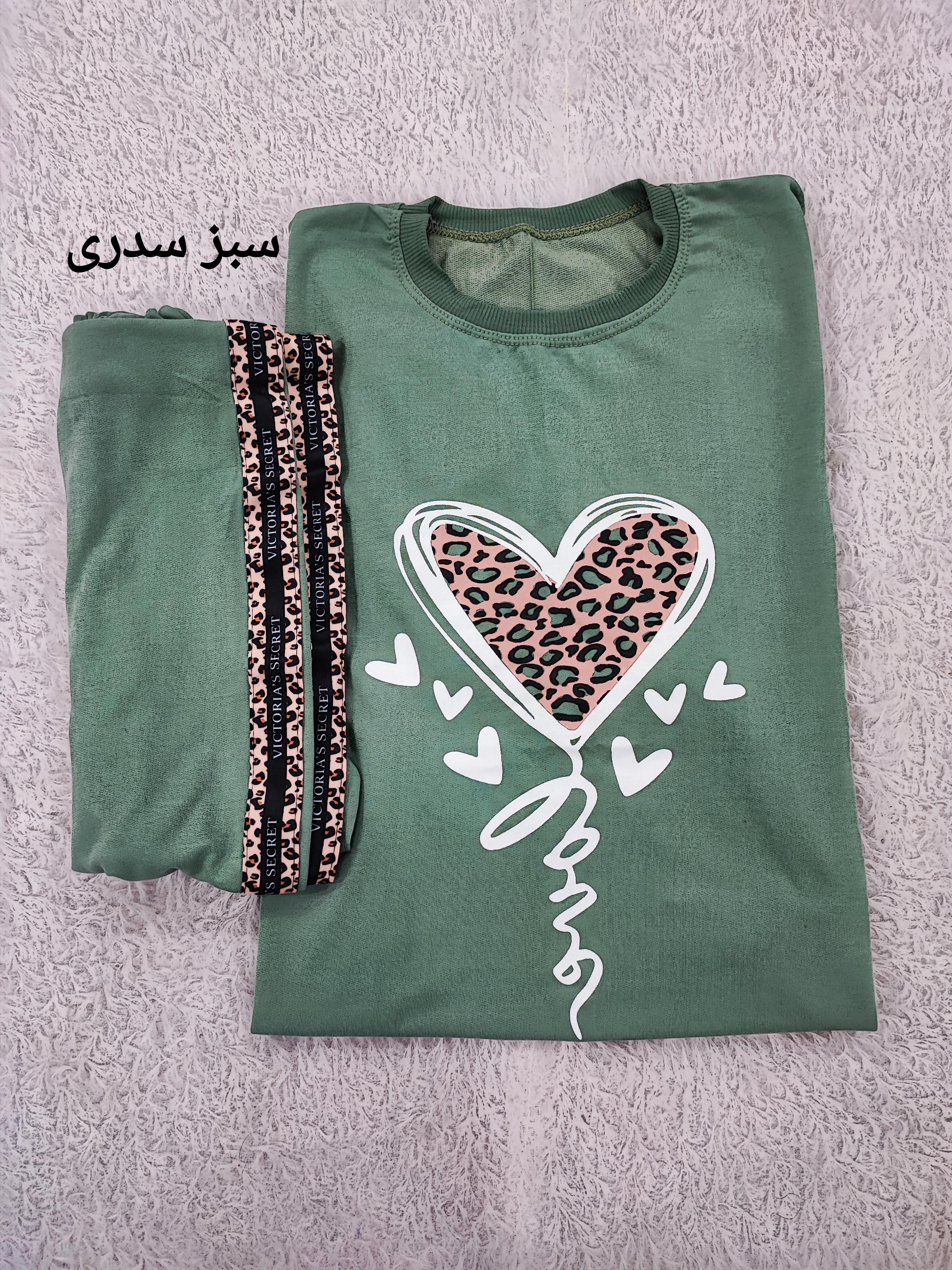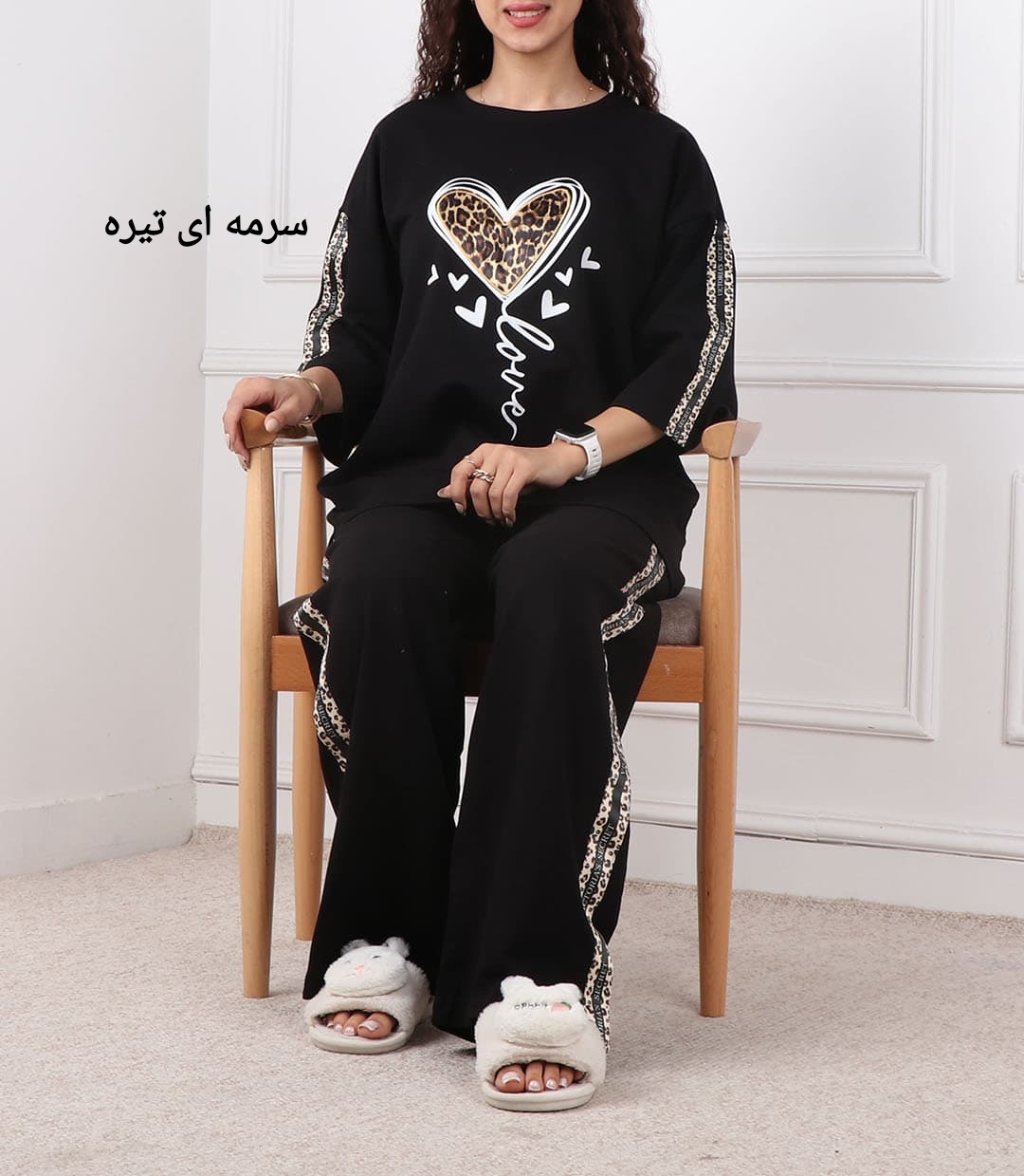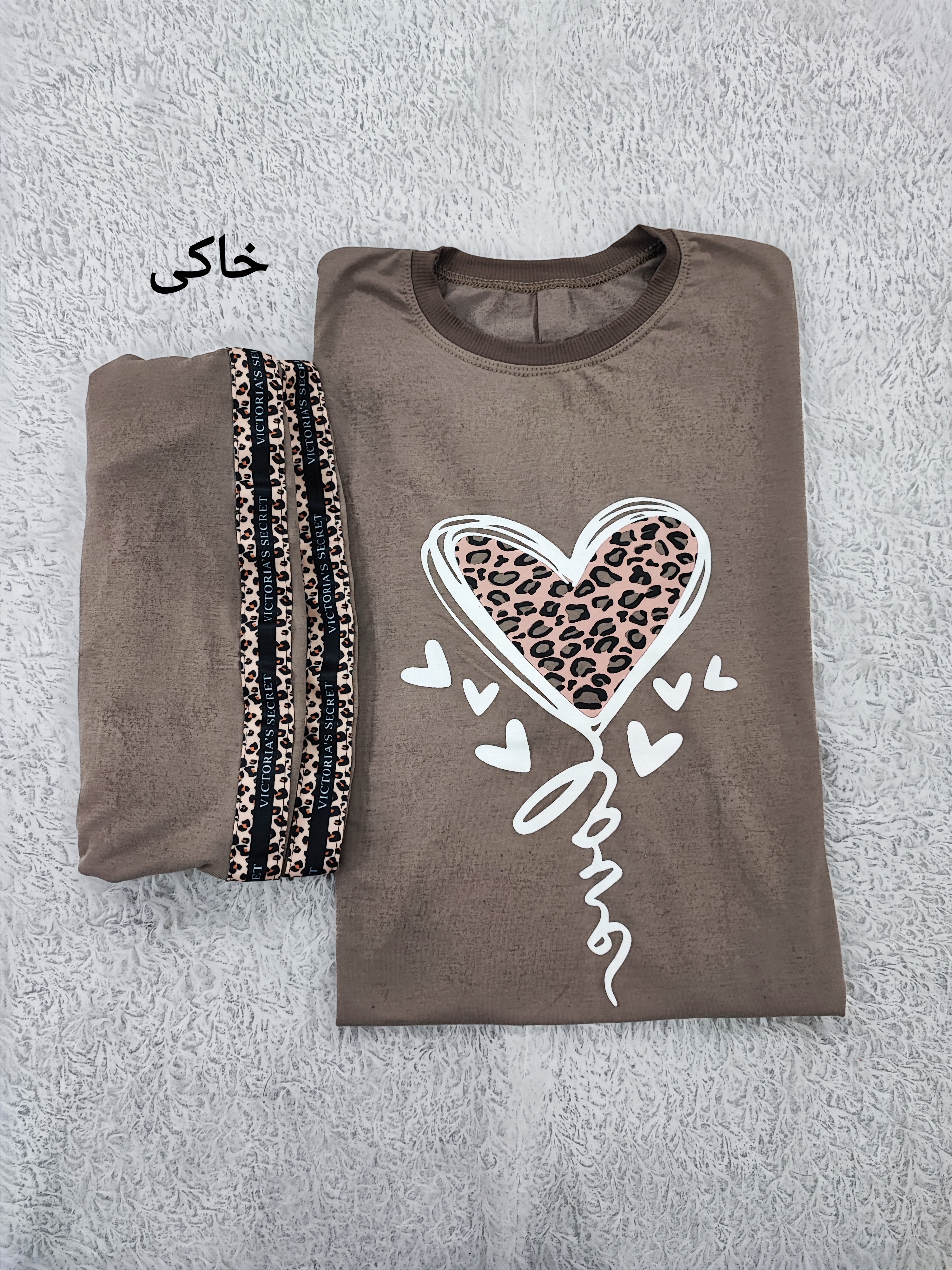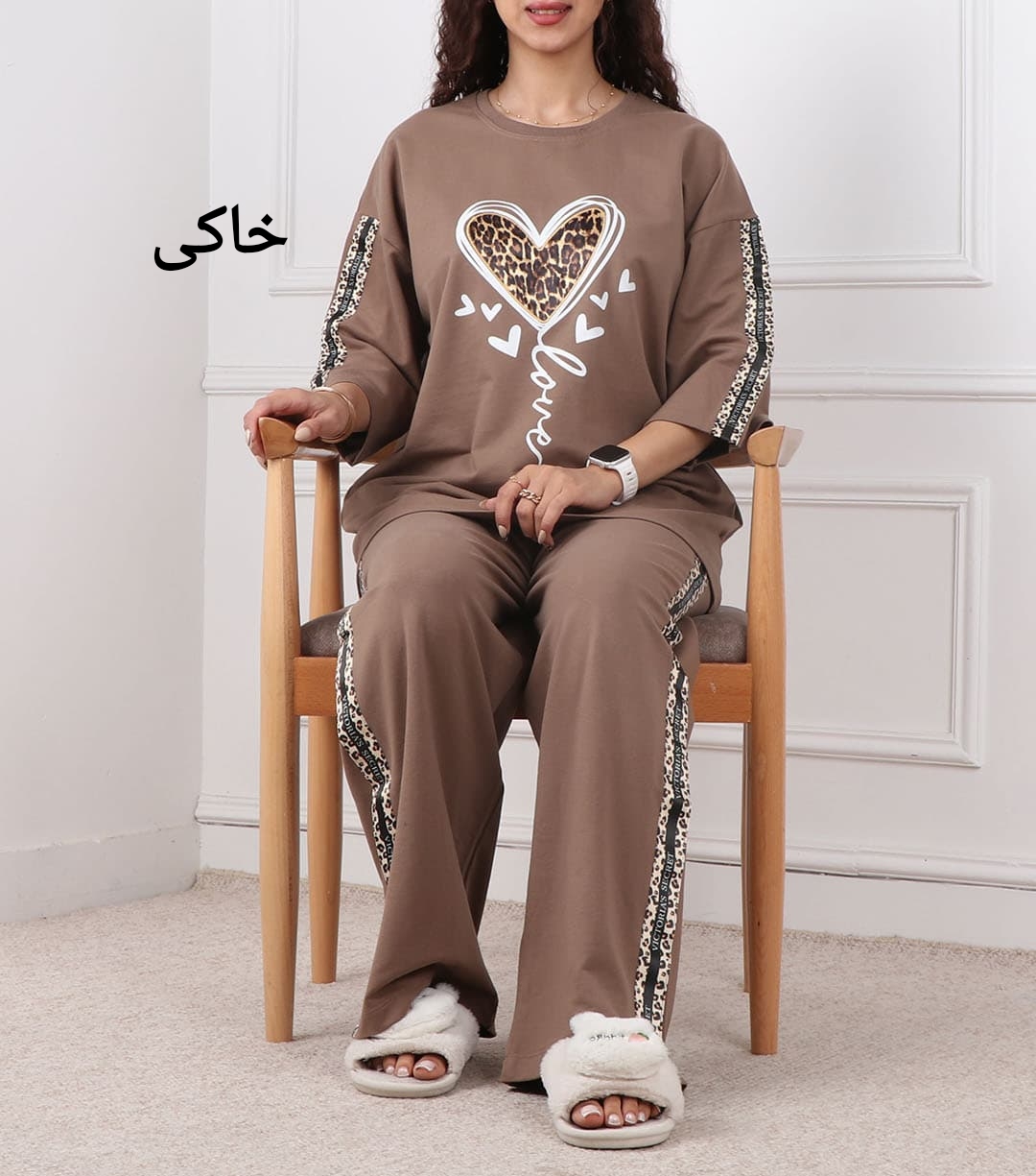 ست تیشرت شلوار دورس قلب پلنگی با نواردوزی پلنگی در کناره های آستین و کناره های شلوار فری سایز تا سایز ۴۶ در ۶ رنگ زیبا با عرض سینه ۵۵ و قد بلوز ۷۵ و قد شلوار ۱۰۰ت