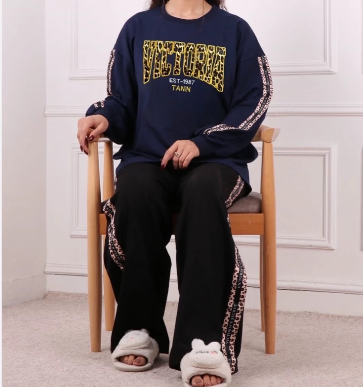 ست بلوز شلوار دورس ویکتوریا با نواردوزی پلنگی در روی آستین ها و کناره های شلوار فری تا سایز ۴۶ در ۶ رنگ زیبا