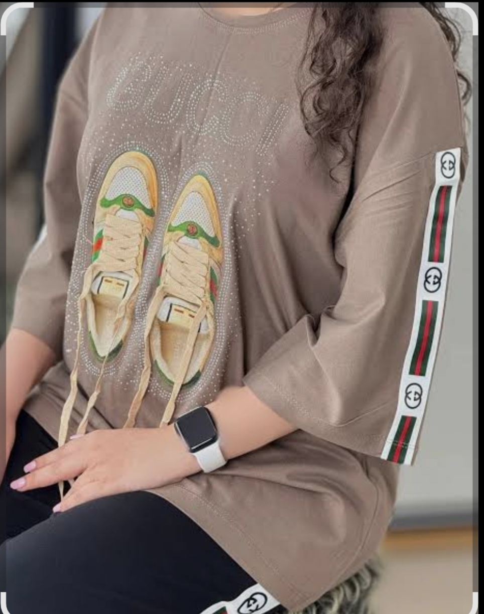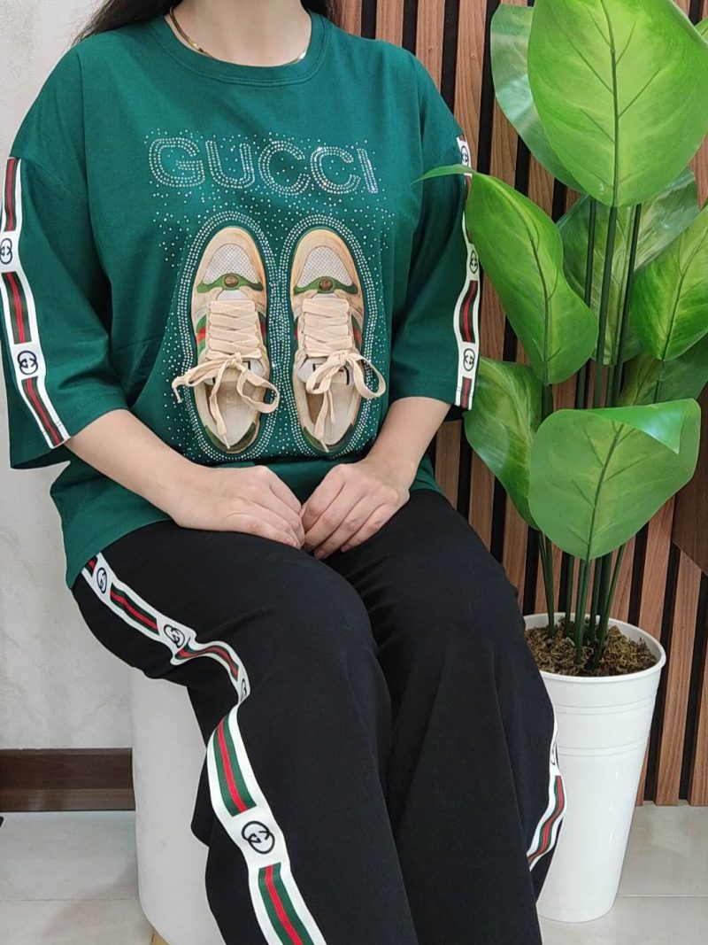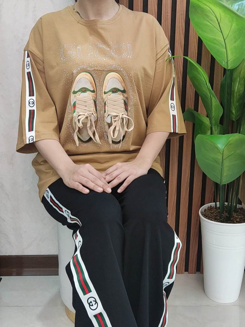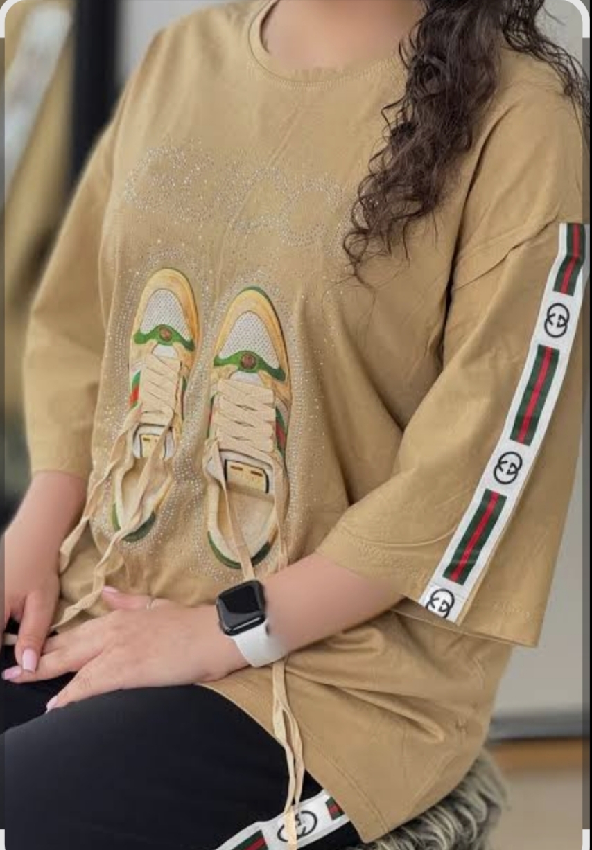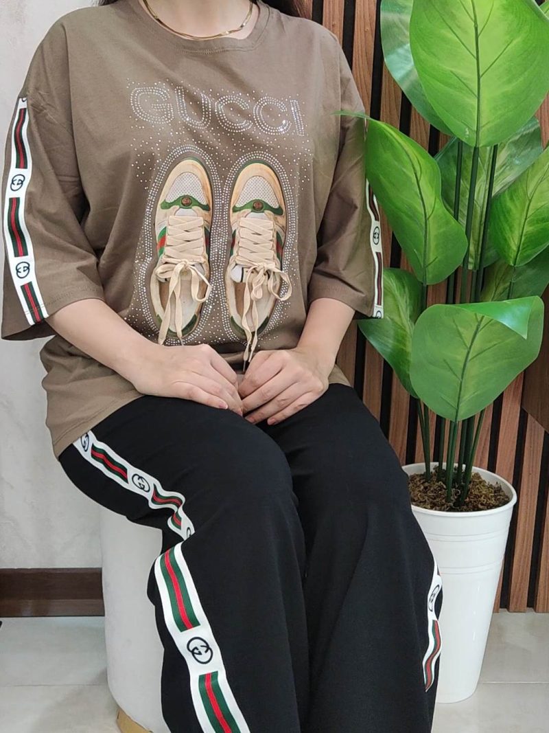 ست سوپر پنبه لانگ کتونی بنددار گلدوزی شده با نگین کوبیده شده بدون ریزش با جنس سوپر پنبه با کیفیت فری تا سایز ۴۸ - ۵۰ در ۶ رنگ خاص که طرح روی تیشرت لانگ تمام گلدوزی شده و نواردوزی سر آستین ها و کنارهای شلوار دوخت شده