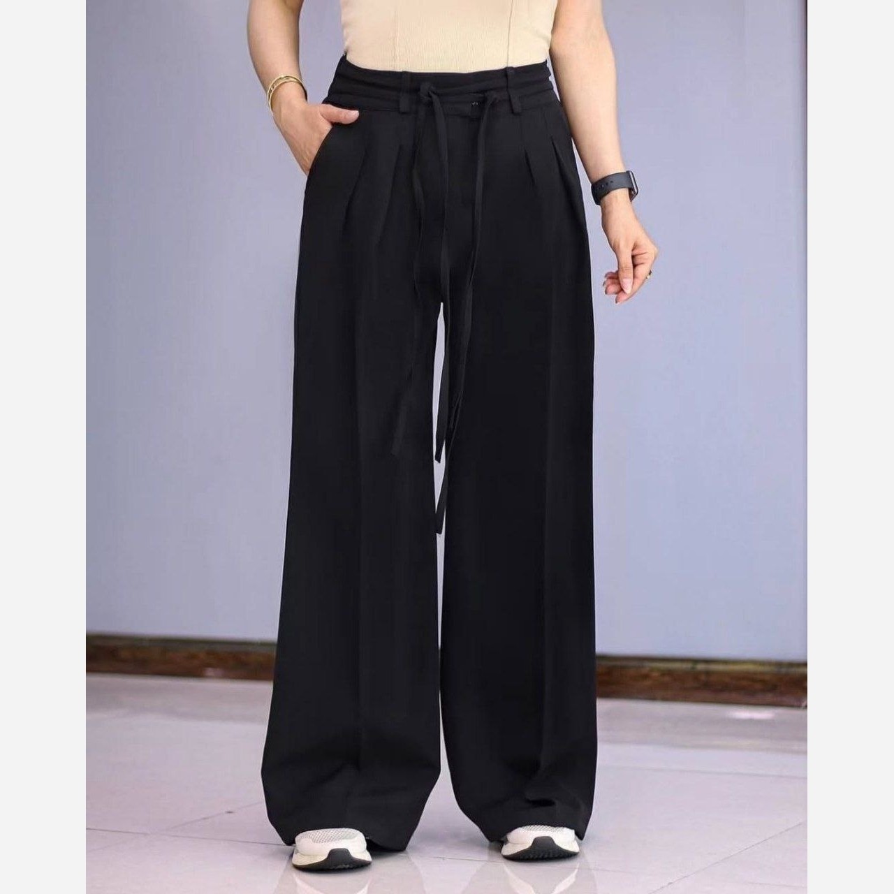 شلوار زنانه مشکی مازراتی دبل بگ با کیفیت رنگ پشت کمر کش دار و جلو دو بند داره و سایزبندی کامل از ۳۸ تا ۵۰ در جدول سایز با قد ۱۰۳ سانت