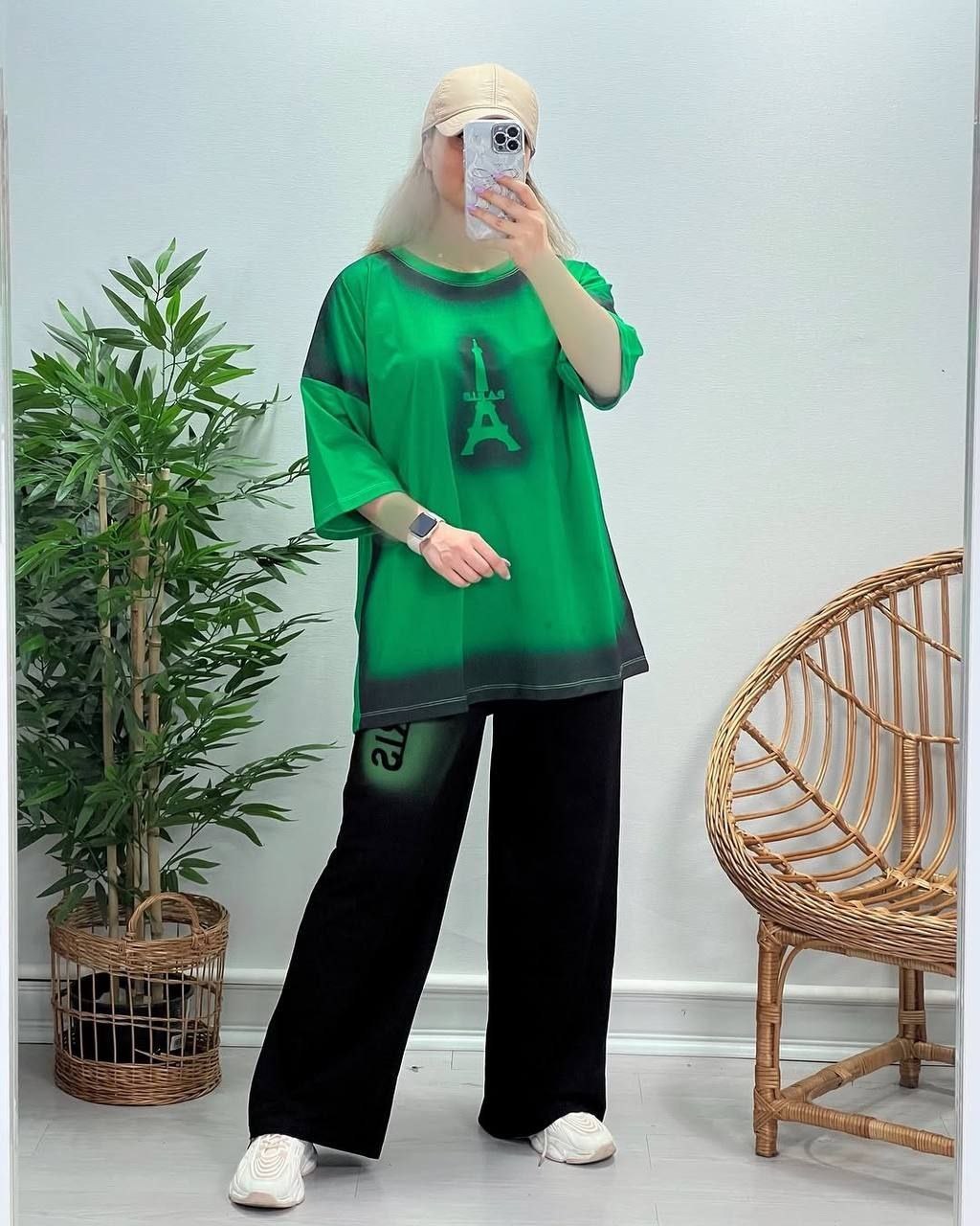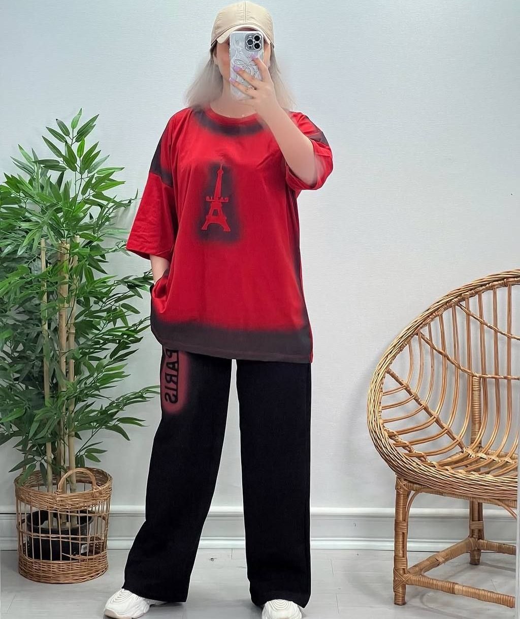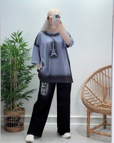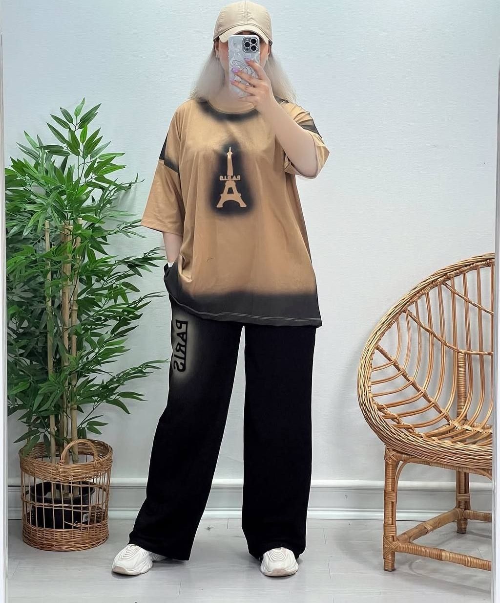 ست تیشرت شلوار بگ ایفل با جنس دورس نرم فری تا سایز ۴۸ مدل شلوار کمرکش جیب دار در رنگبندی عالی طبق جدول