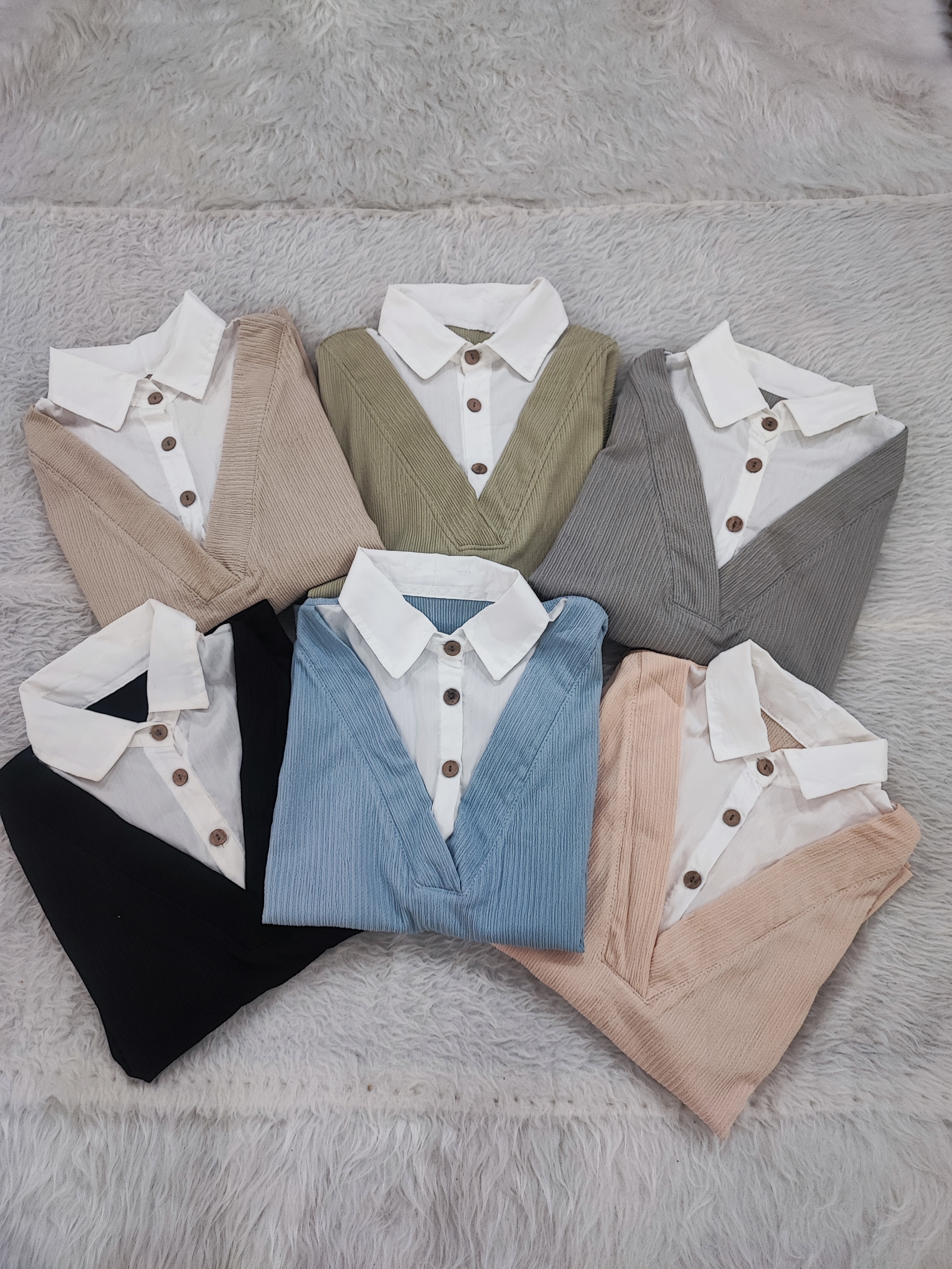 شومیز مراکشی با جنس کبریتی مدل یقه دار آستین بلند فری تا سایز ۴۶ در ۶ رنگ با قد ۷۰ سانت