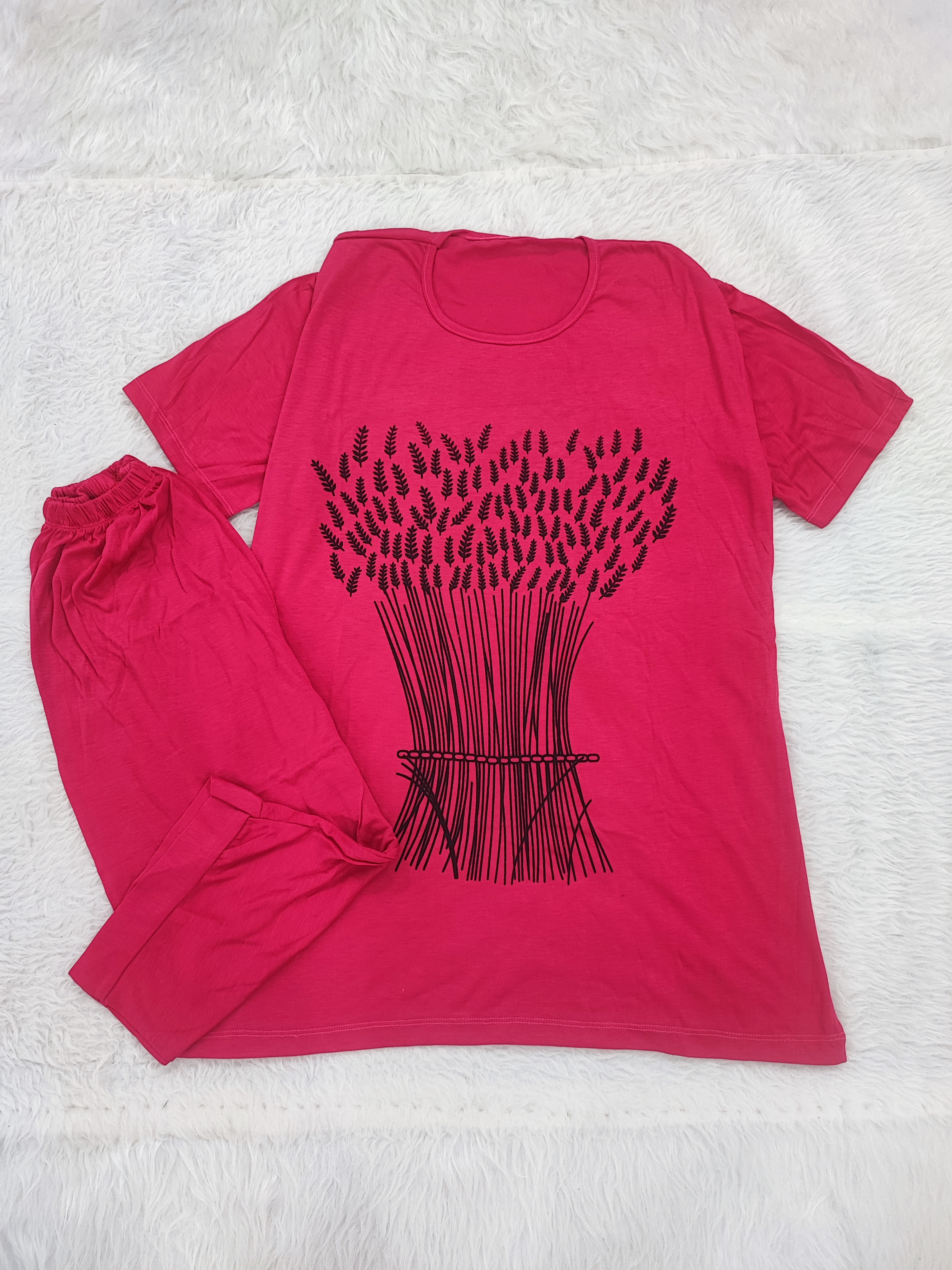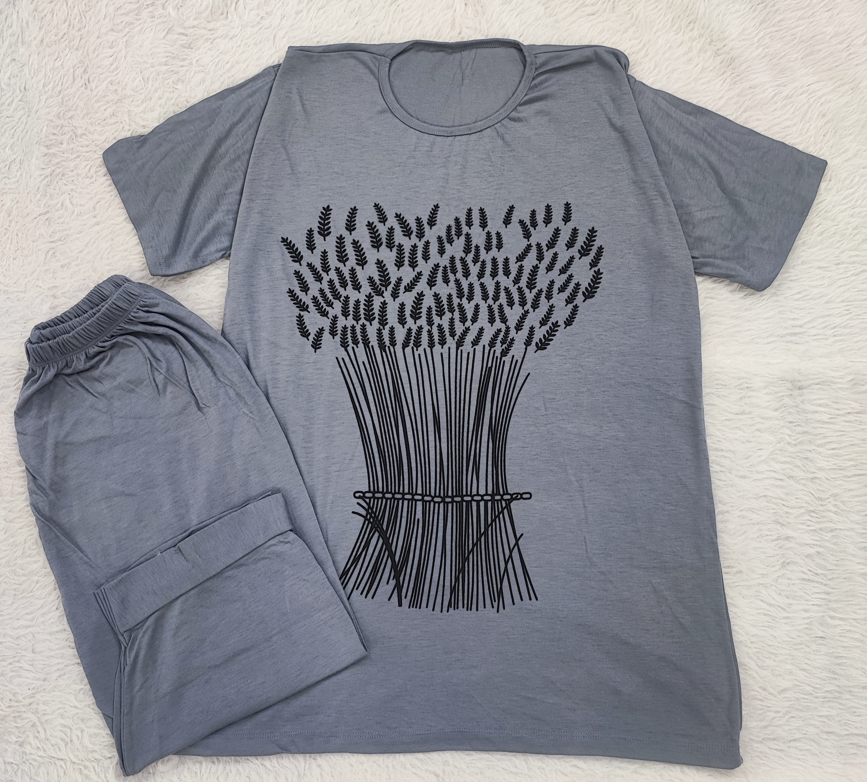 ست تیشرت شلوارک سایز بزرگ در دو طرح خوشه گندم و طرح گل مناسب از سایز ۴۲ تا ۵۴ جنس بسیار نرم و لطیف در چند رنگ طبق عکس های غیر ژورنال مطابق با جدول انتخاب رنگ