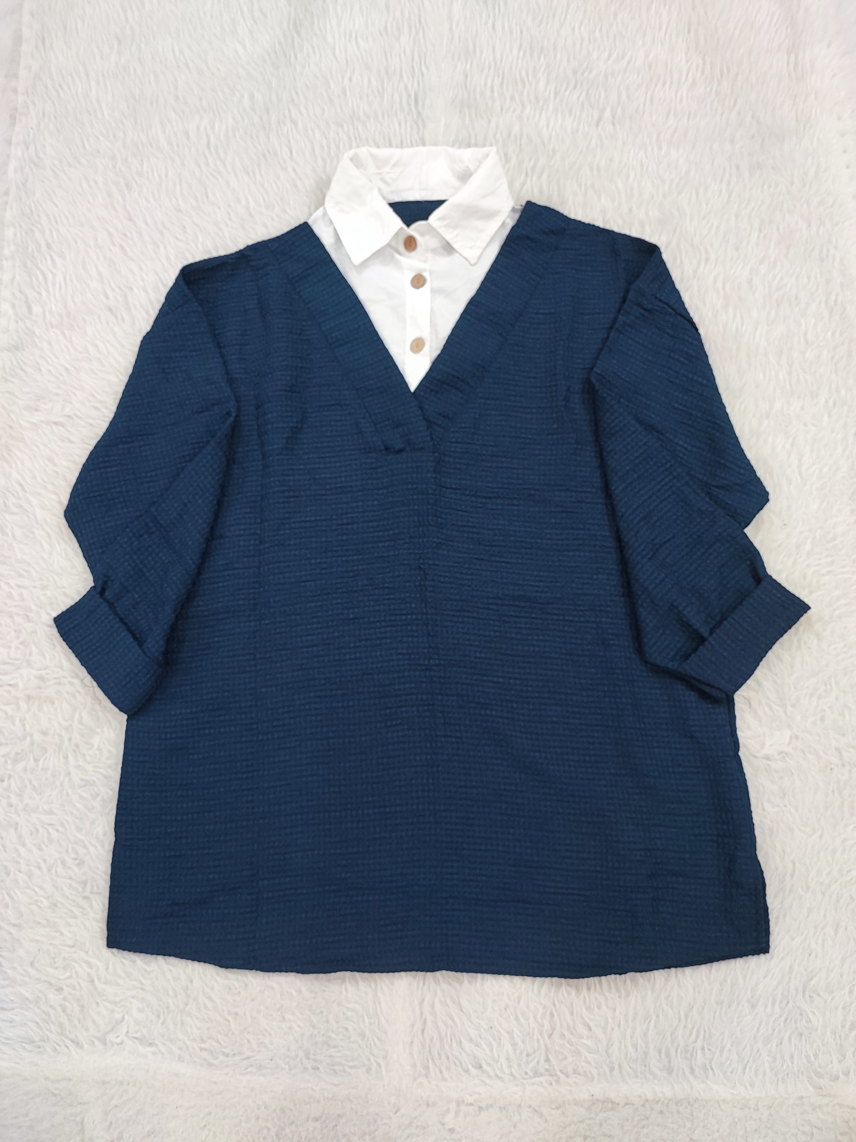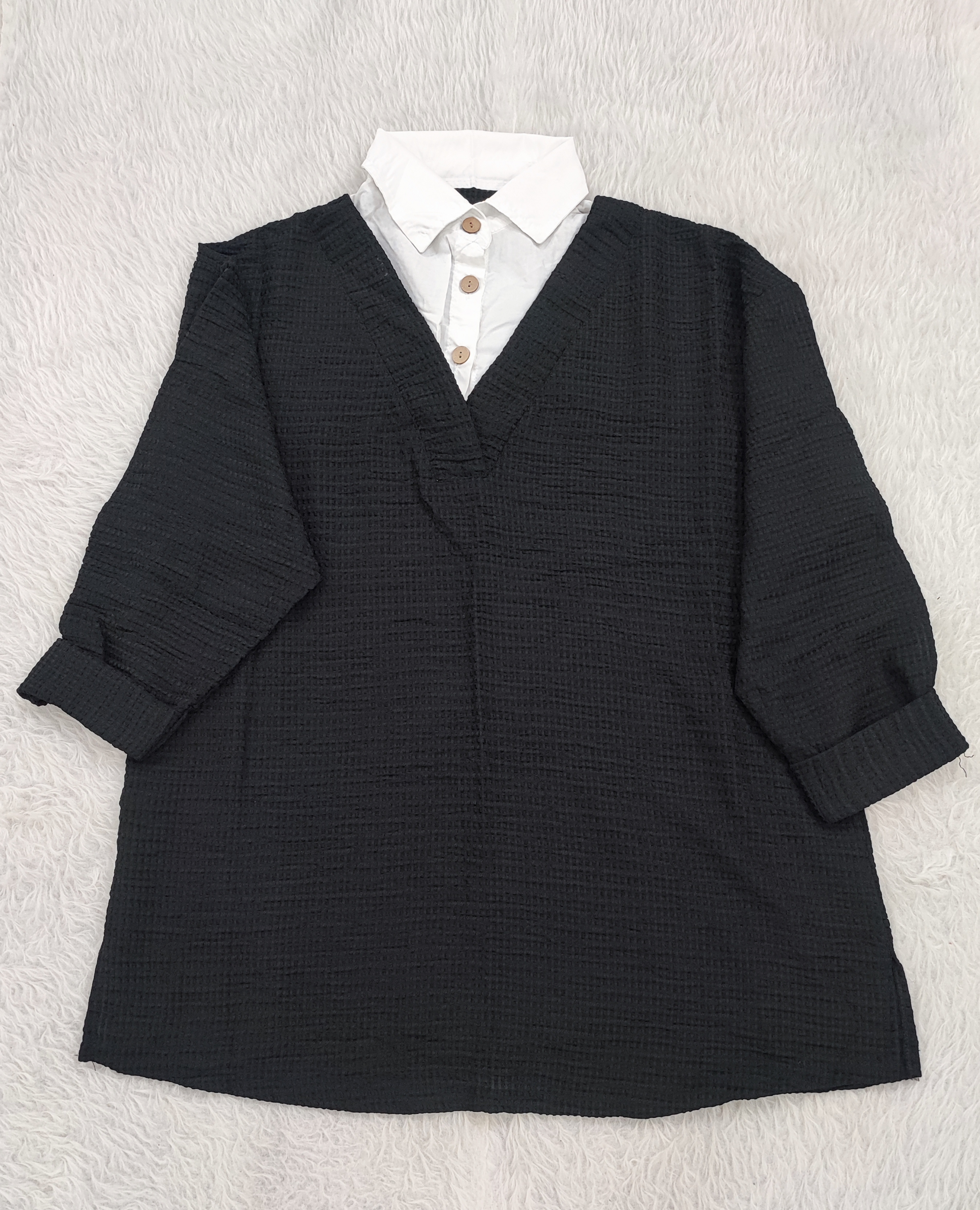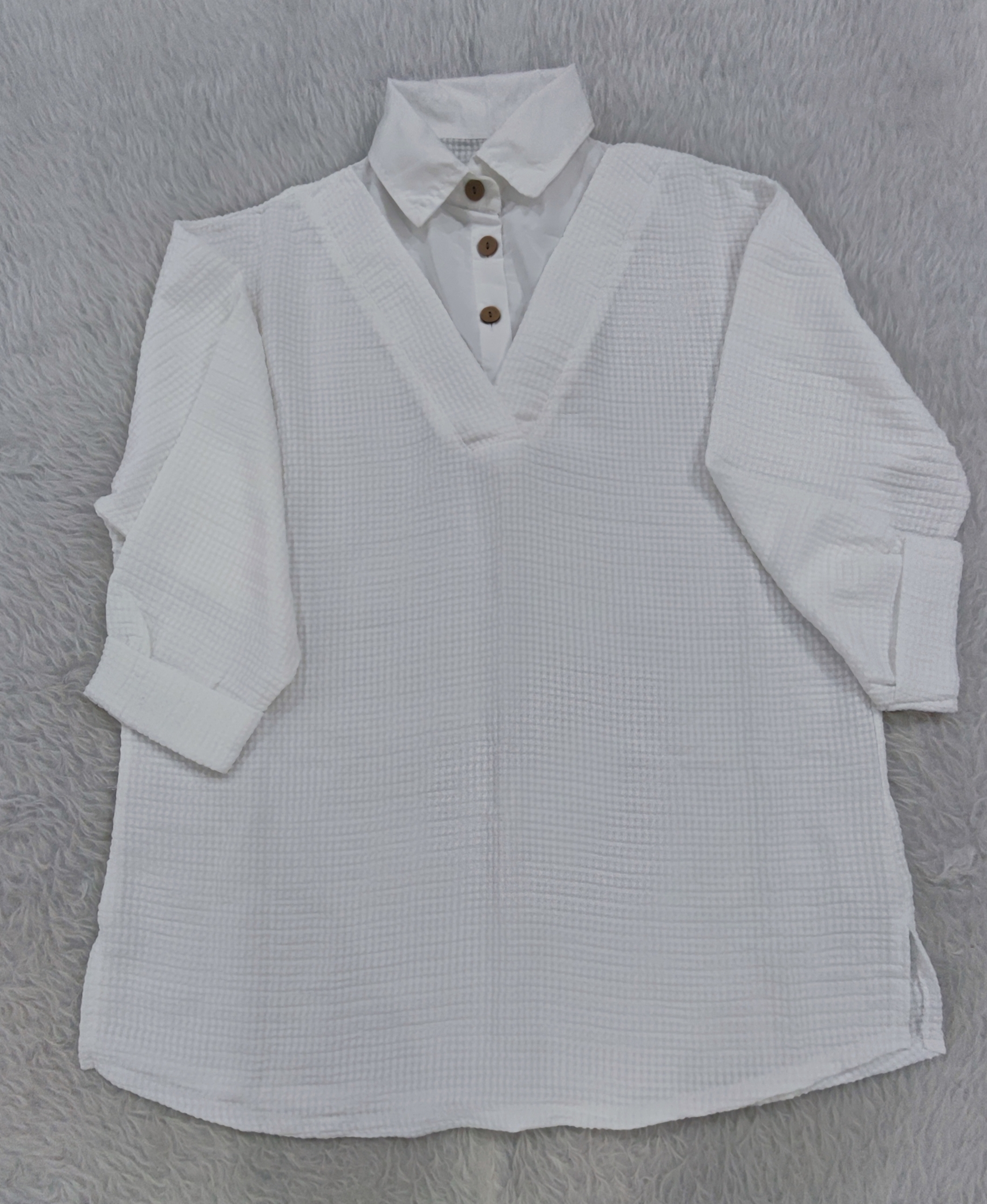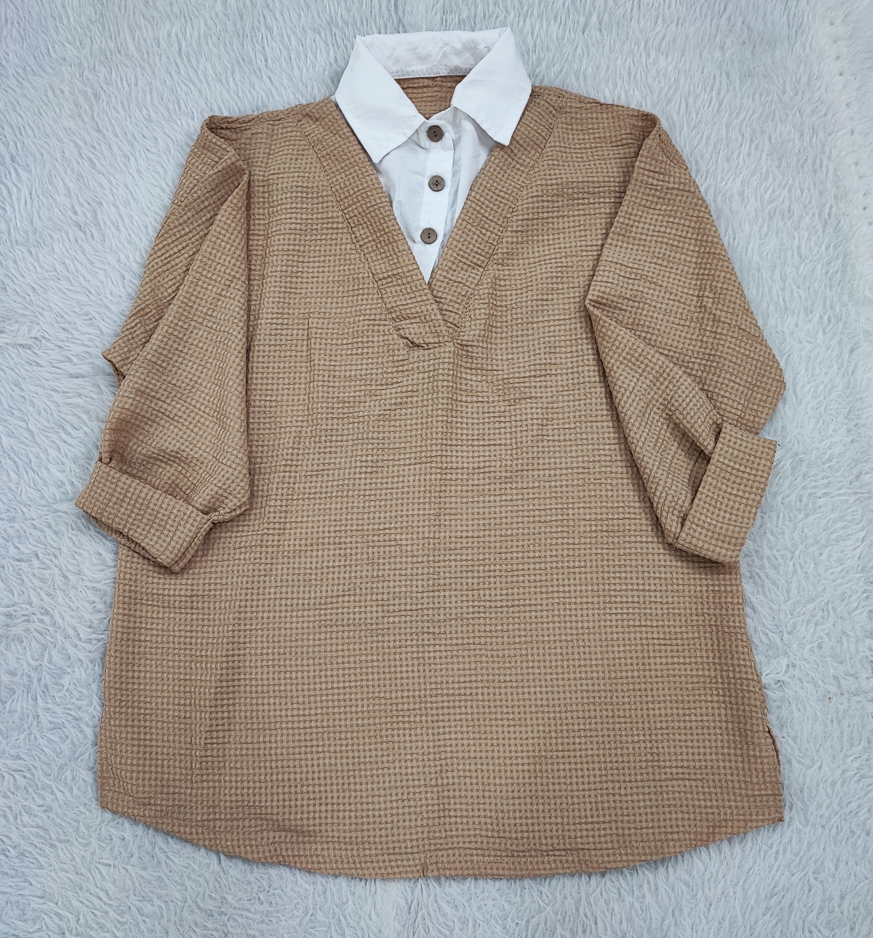 شومیز مانتویی حصیری پفکی مدل یقه دار آستین بلند پاکتی فری تا سایز ۴۸ با قد ۸۰ سانت