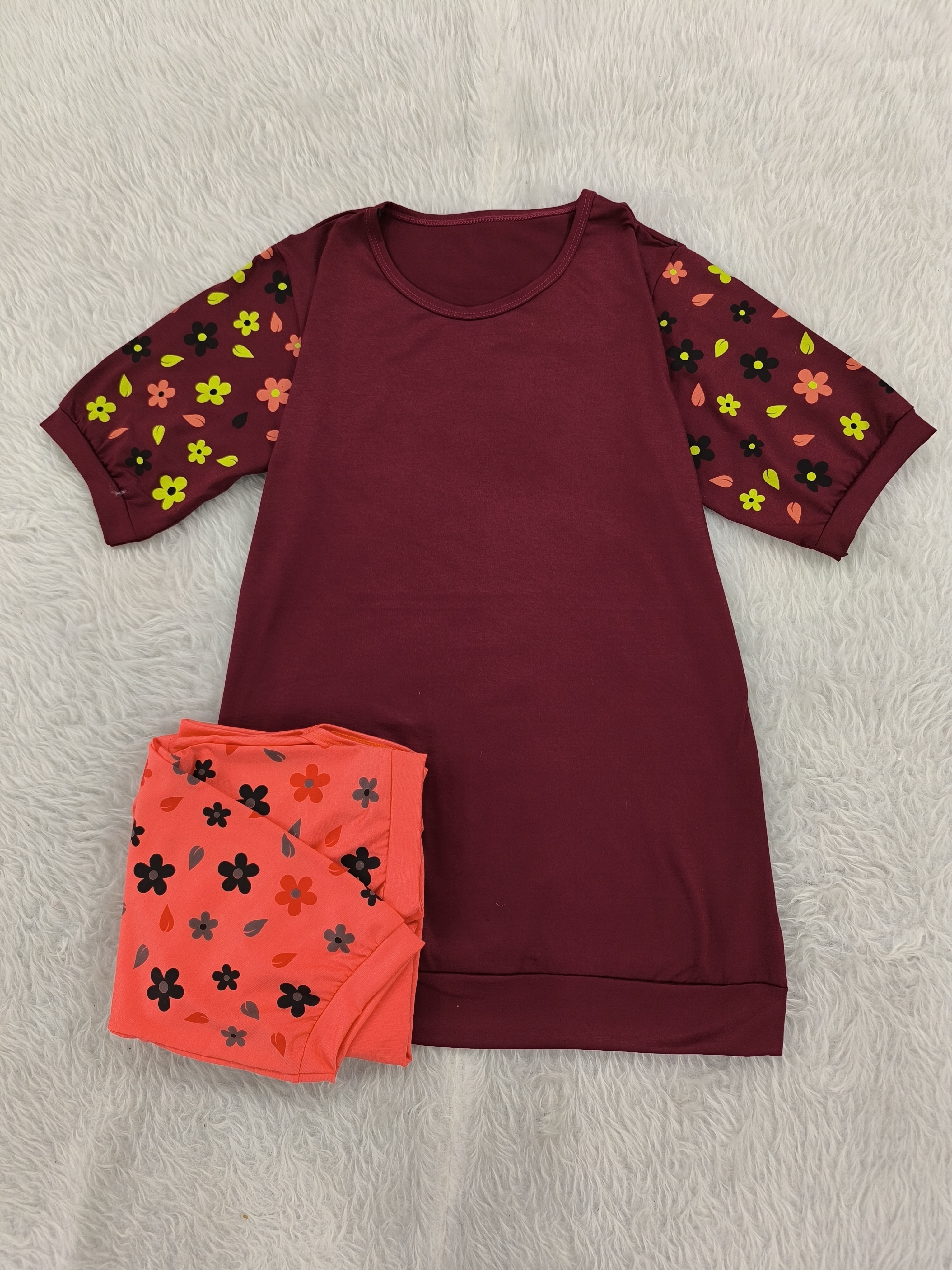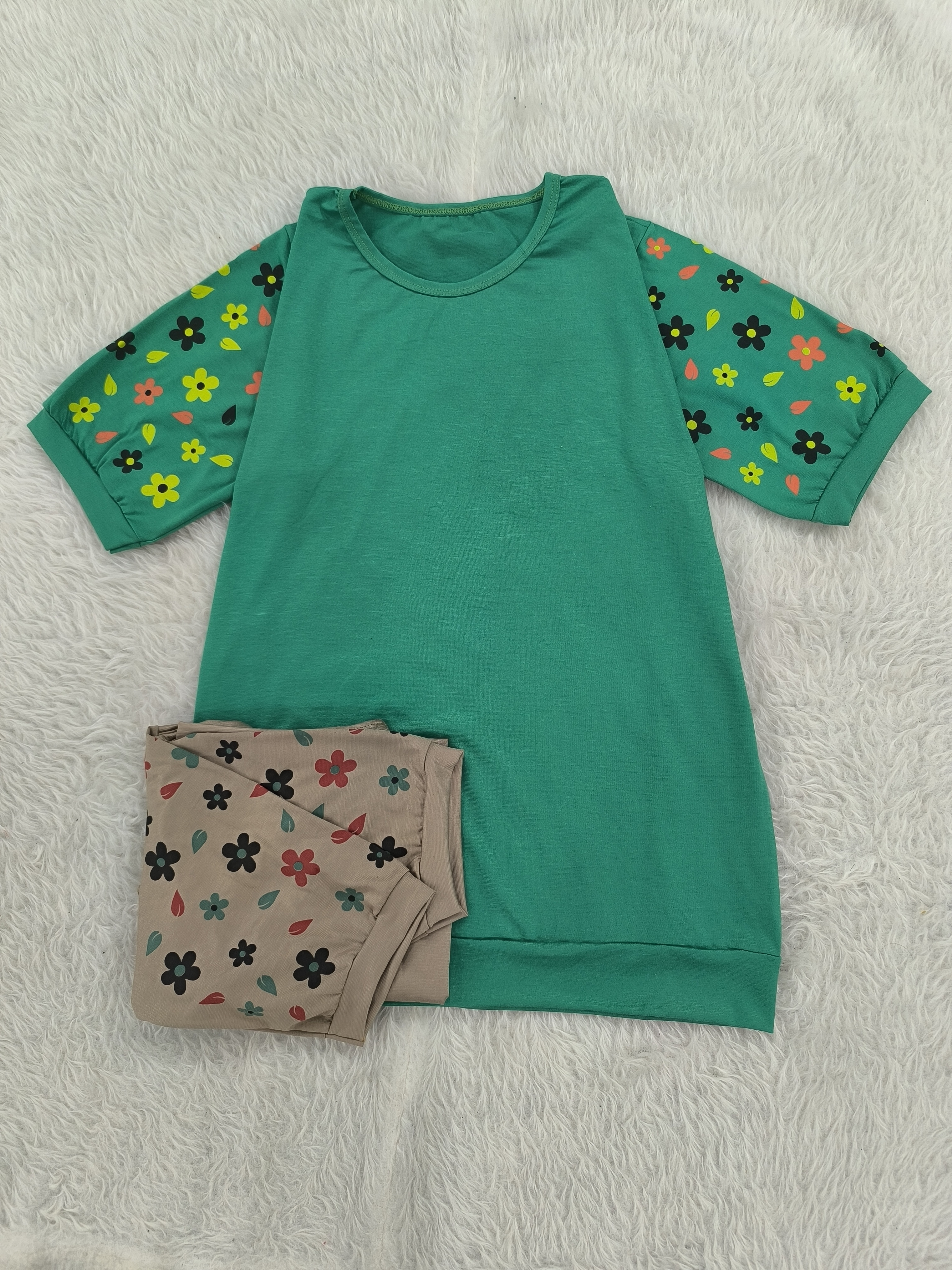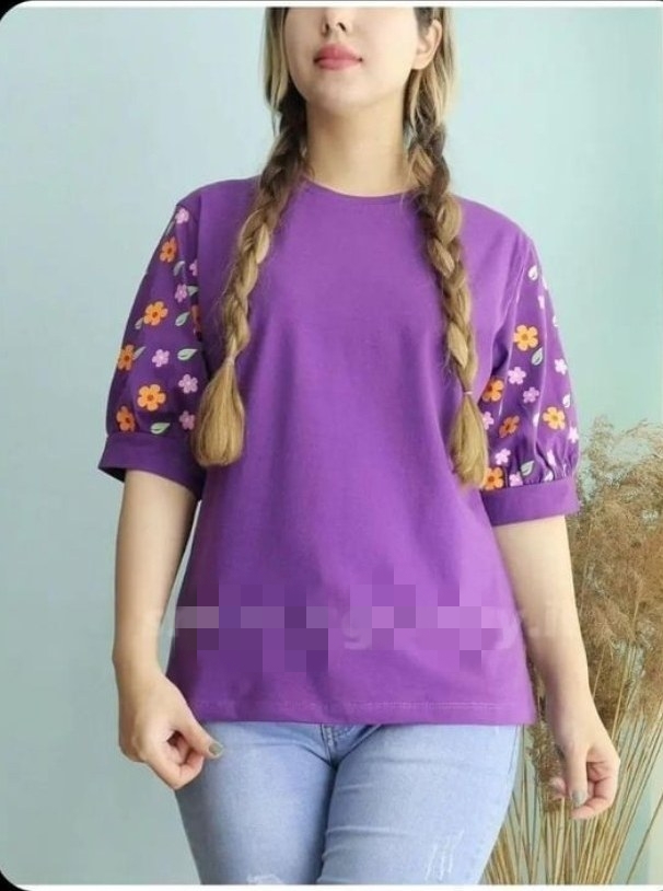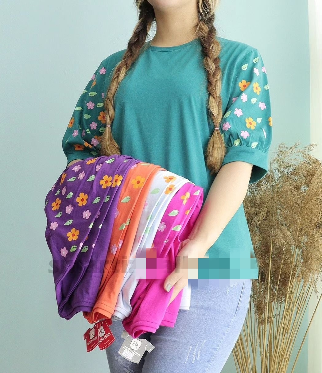 تیشرت آستین گلدار جنس پنبه ویسکوز نرم فری تا سایز ۴۶ در رنگبندی با قد ۷۰ سانت