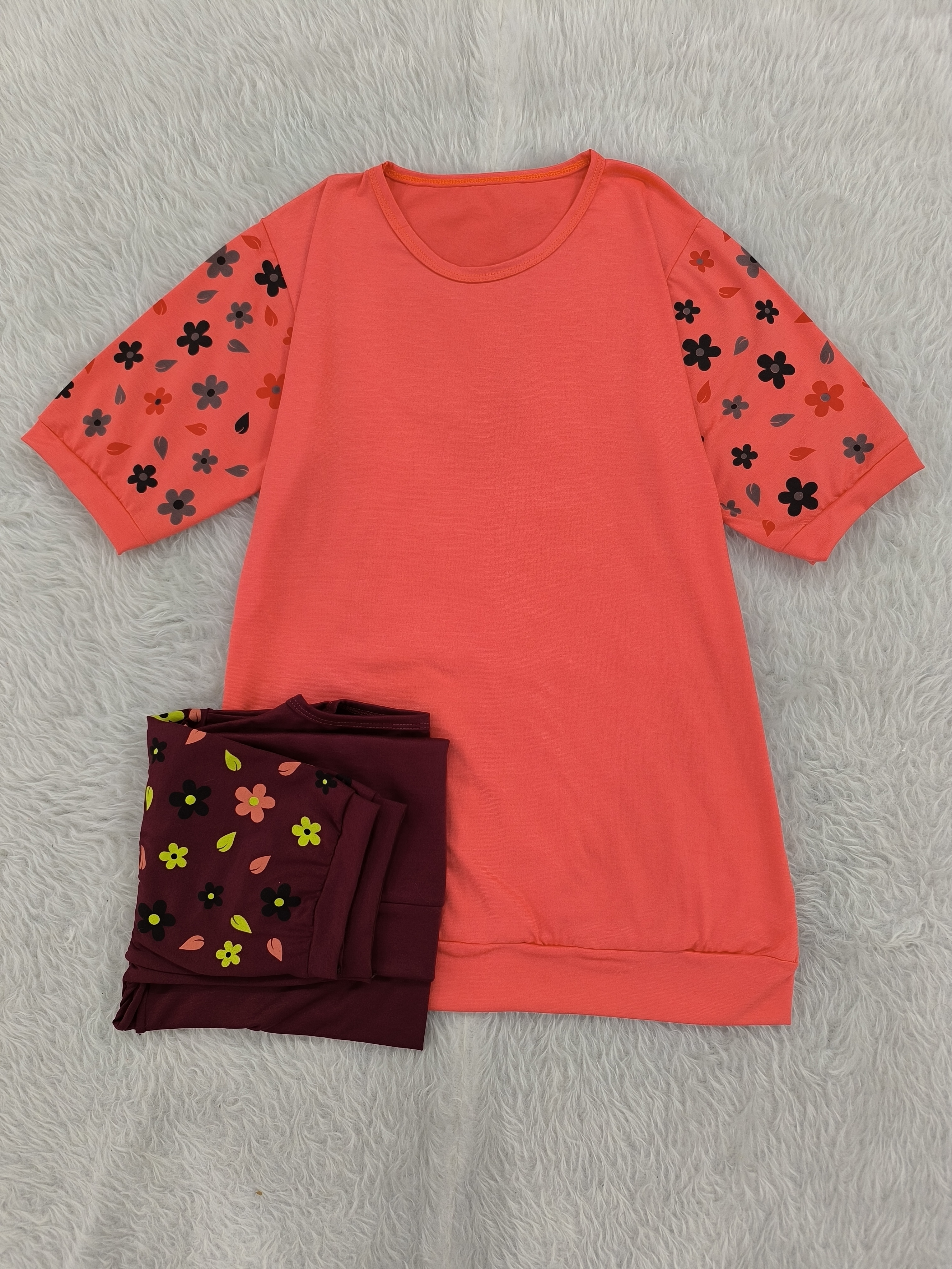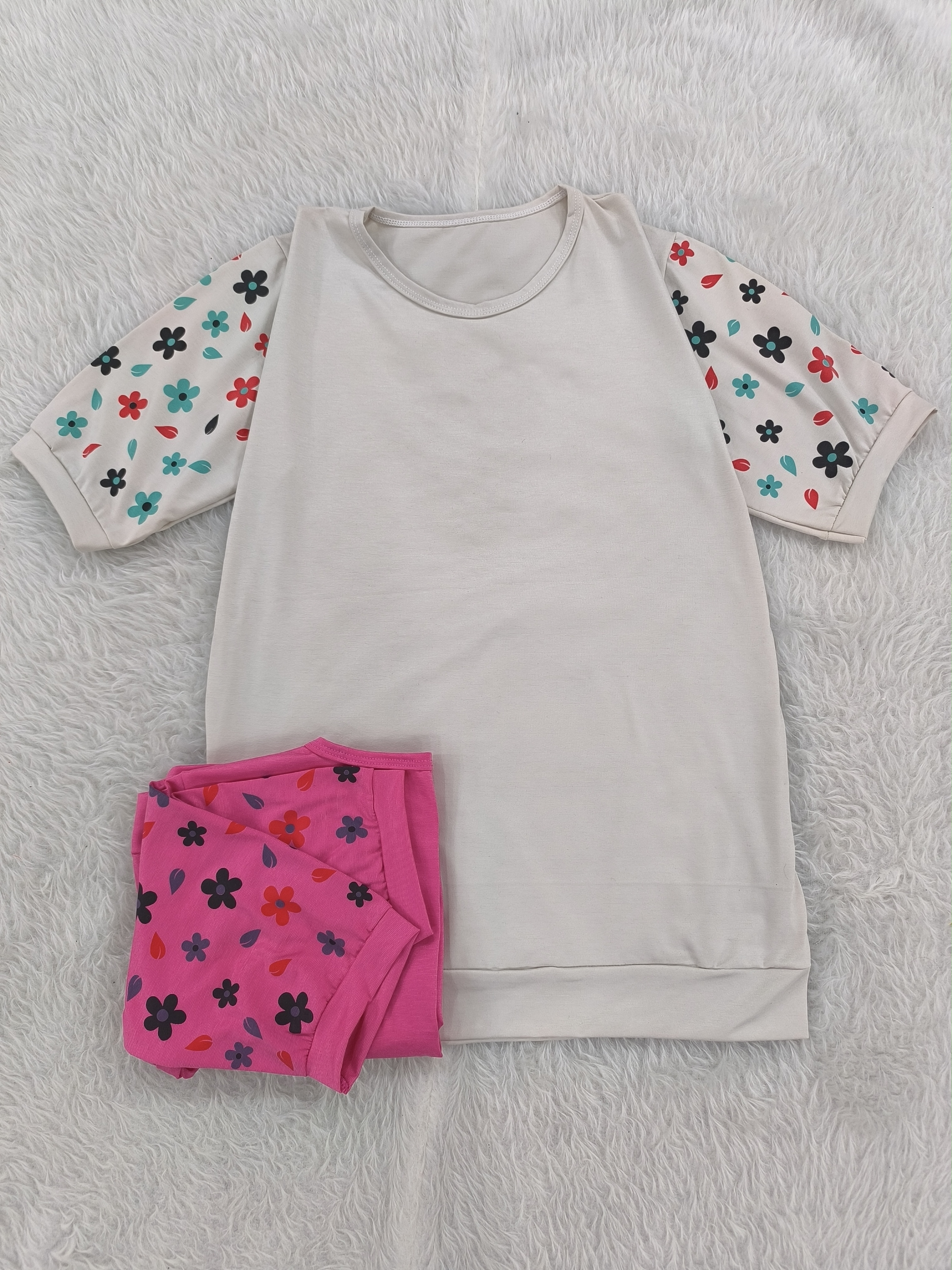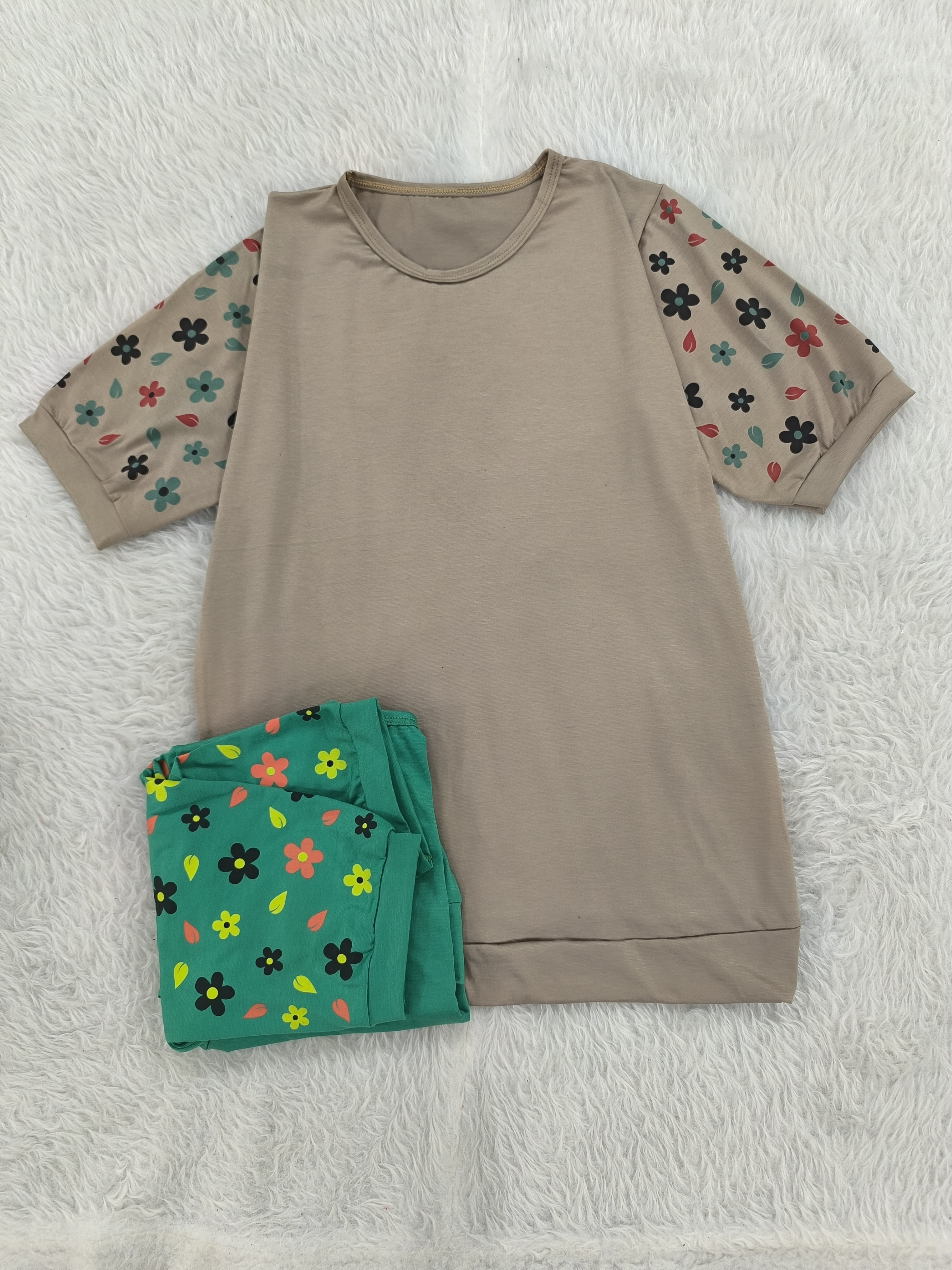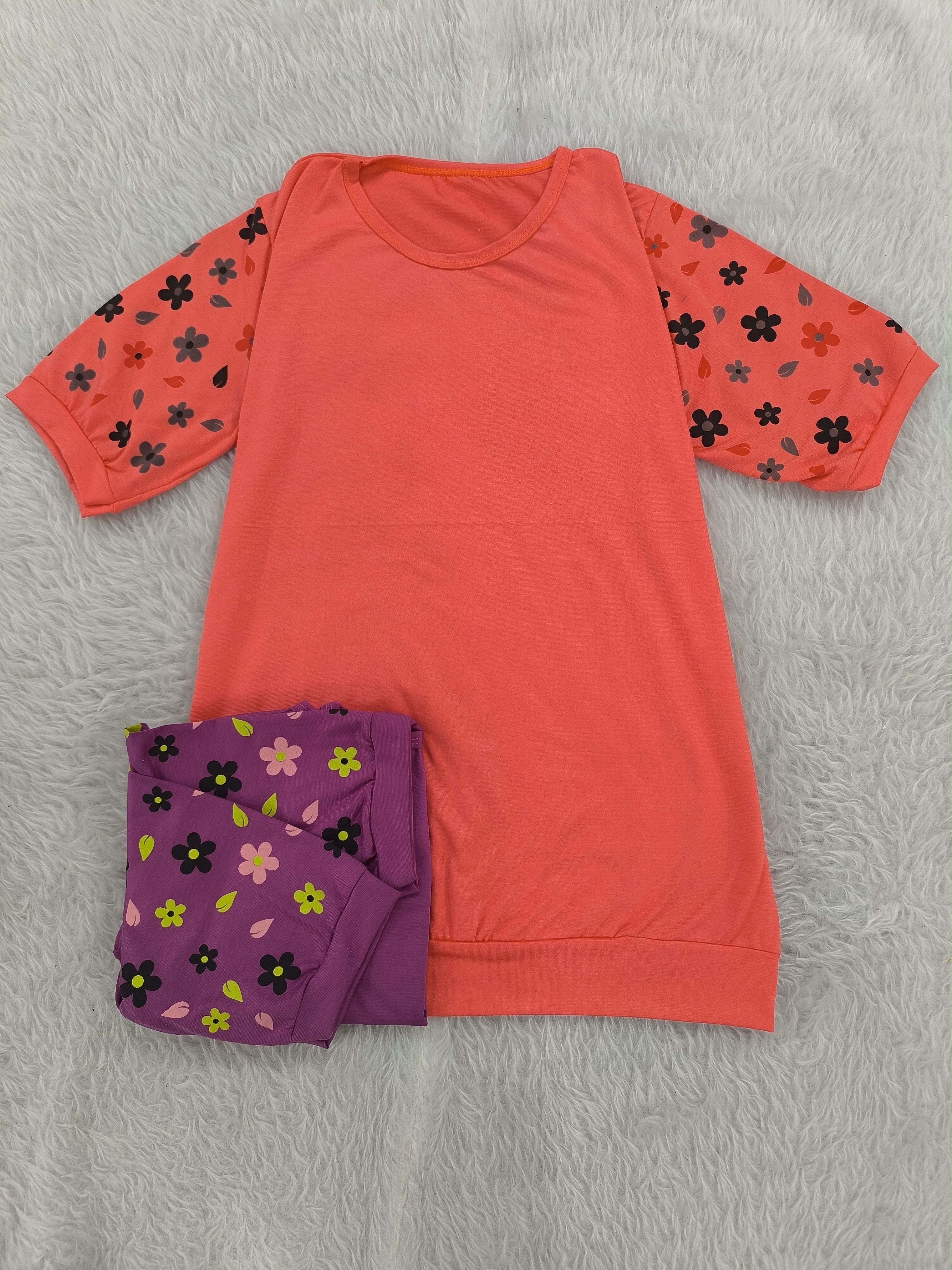 تیشرت آستین گلدار جنس پنبه ویسکوز نرم فری تا سایز ۴۶ در رنگبندی با قد ۷۰ سانت