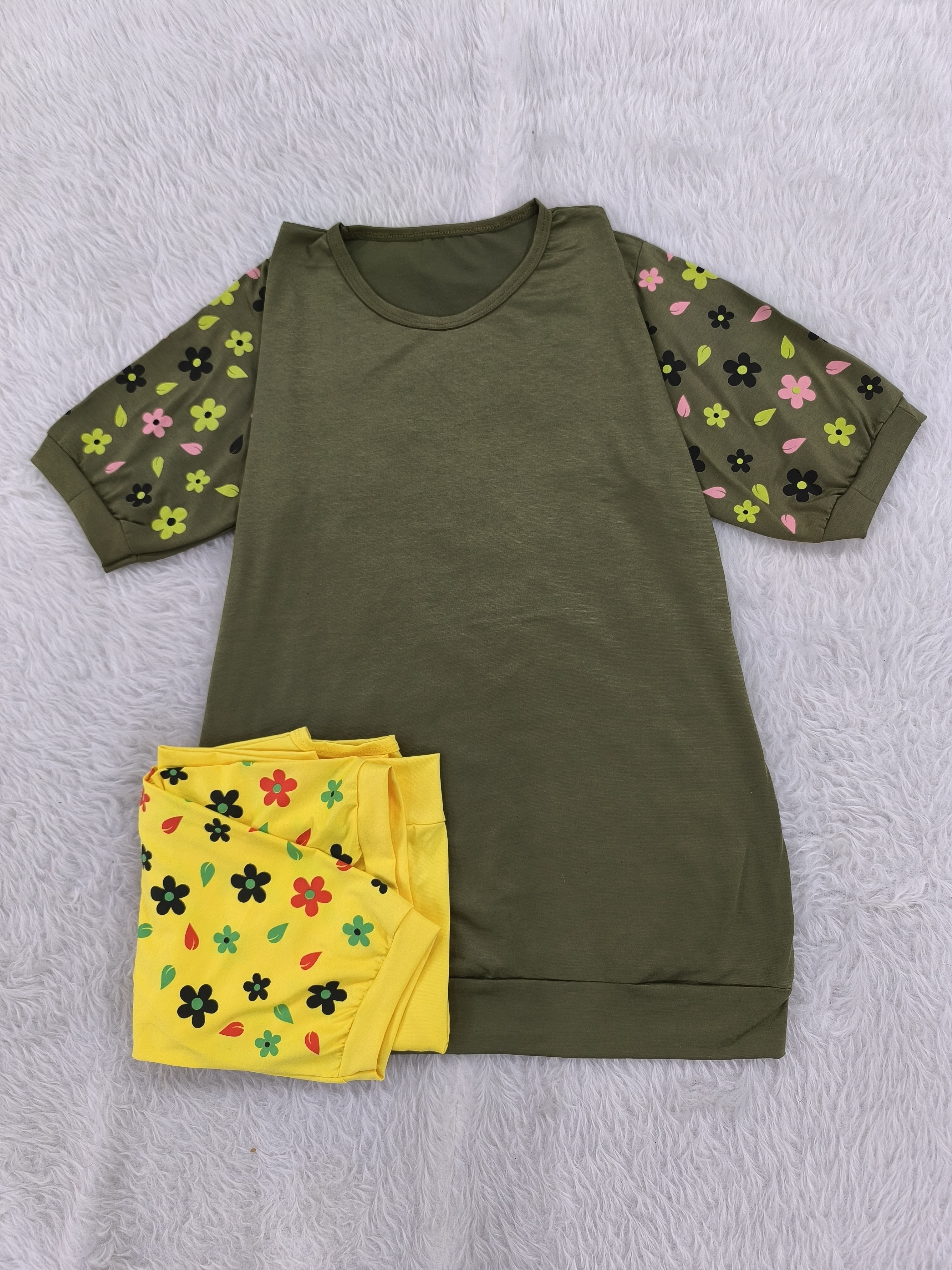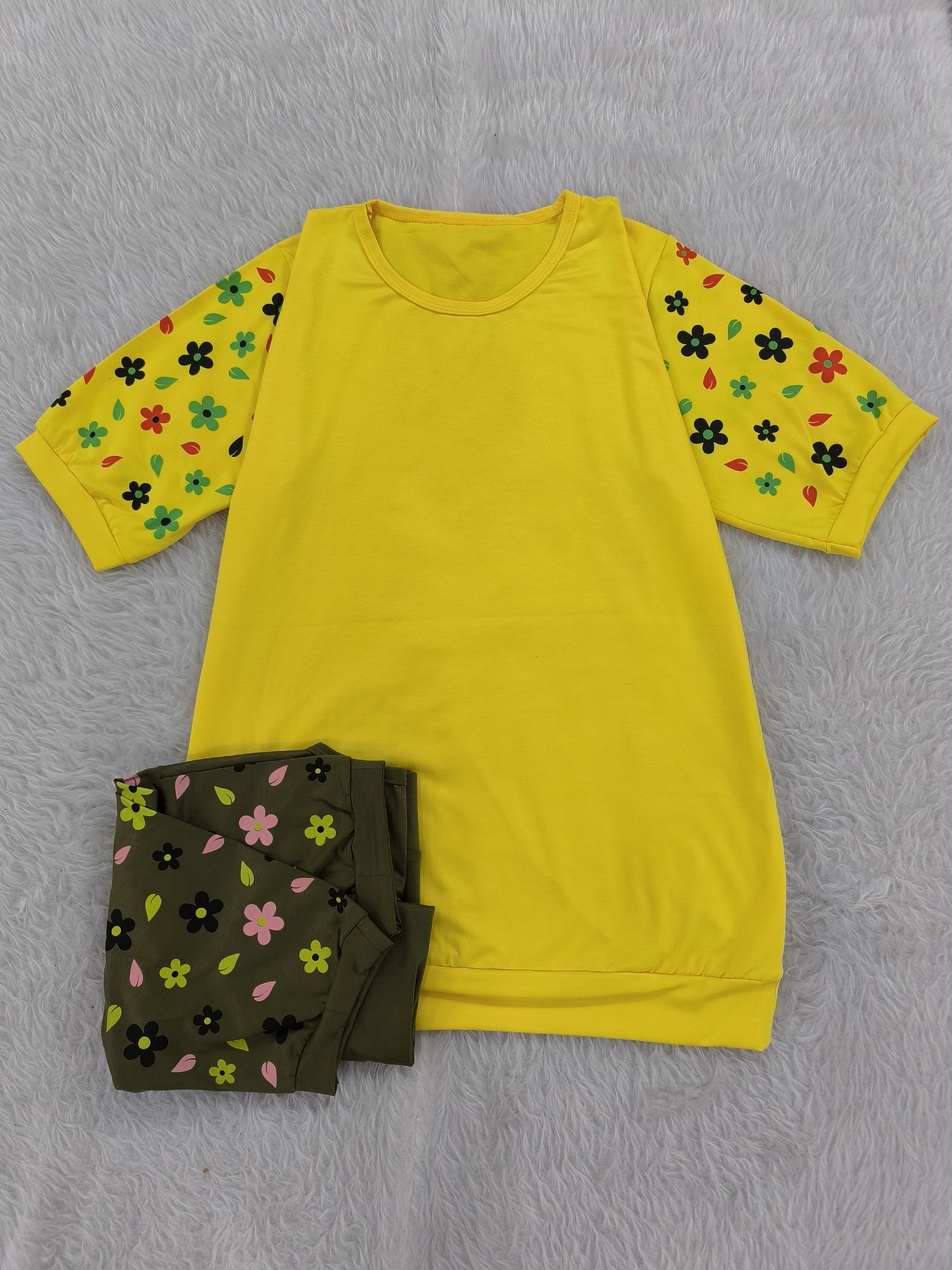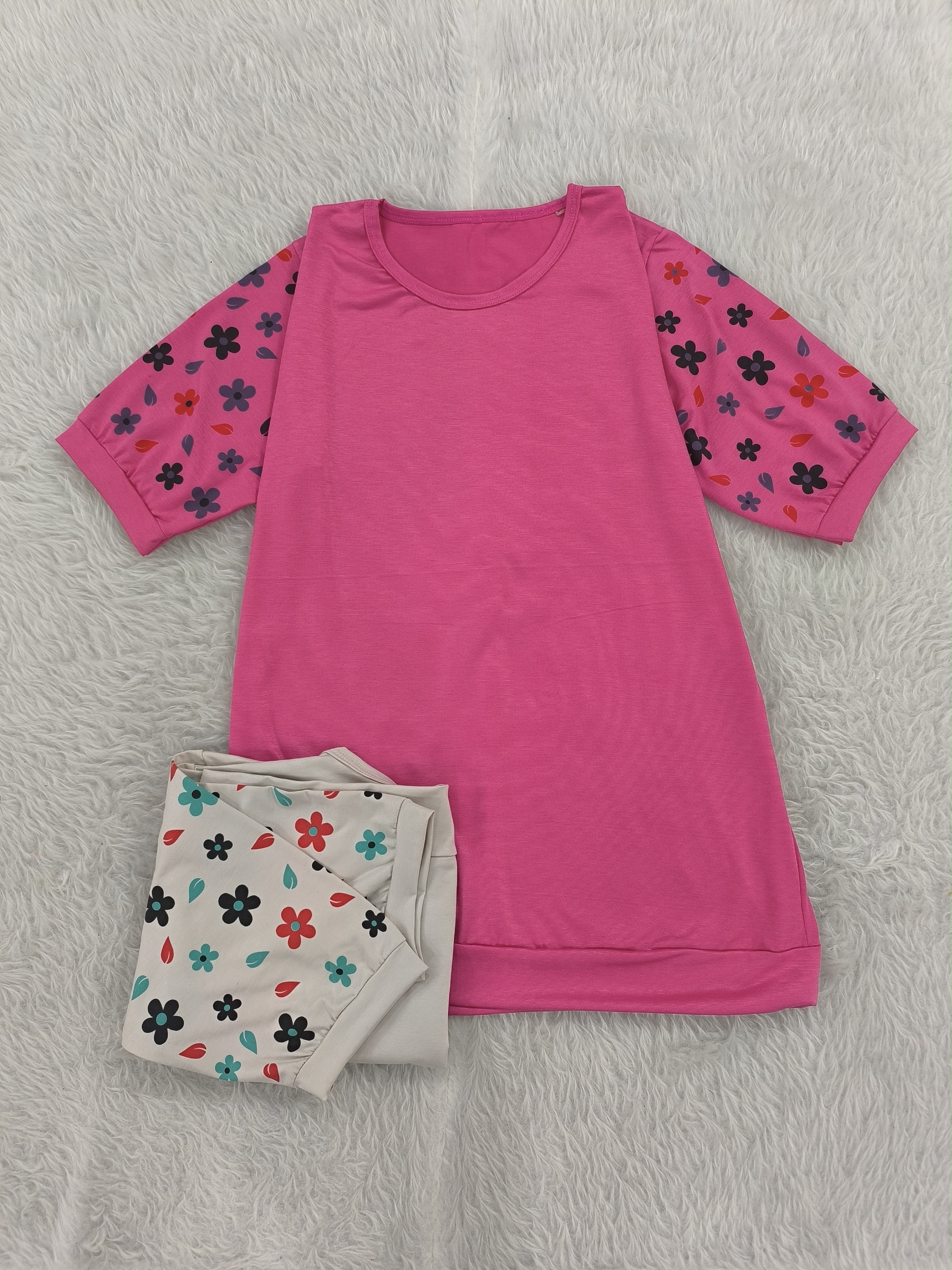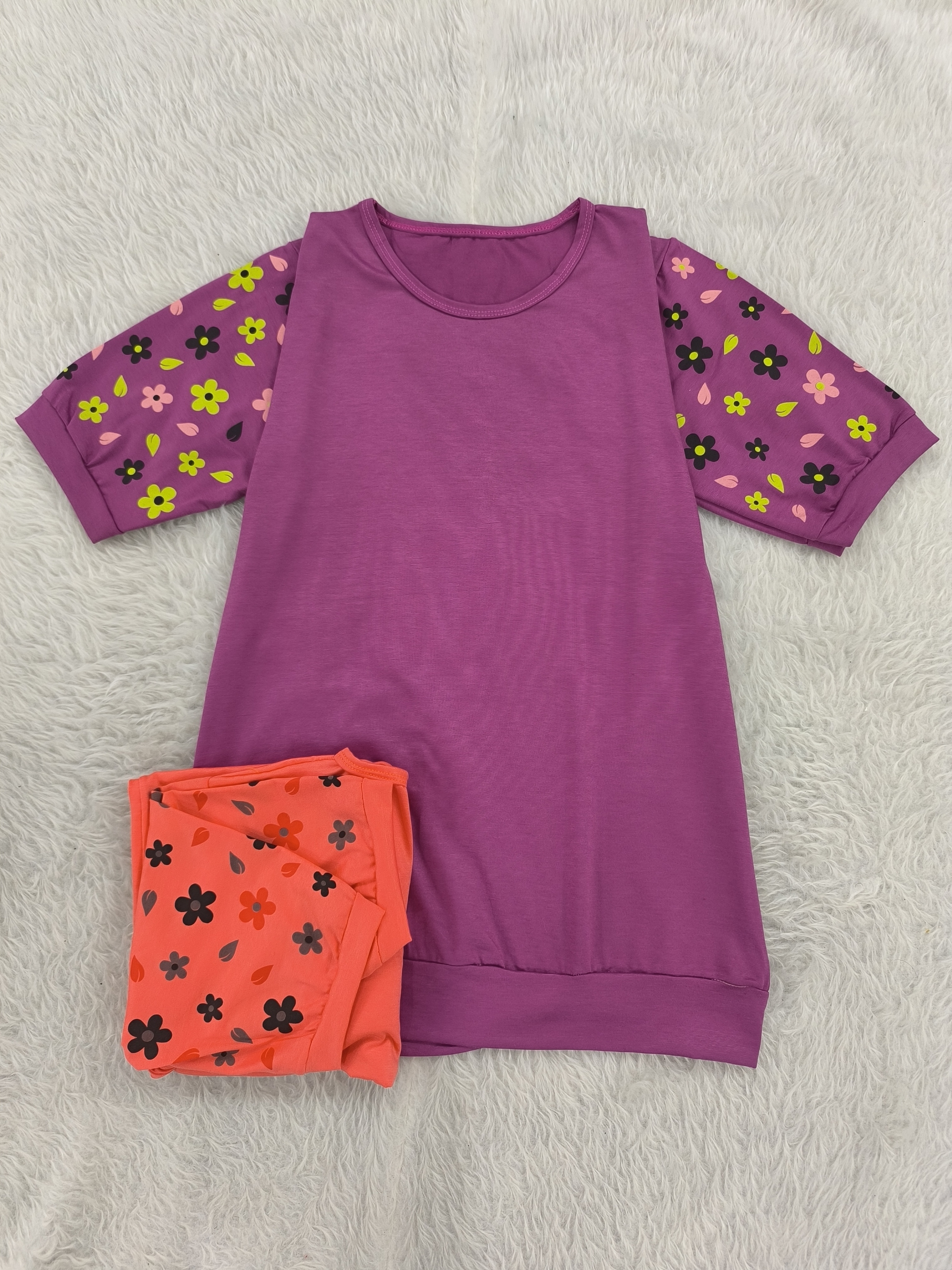 تیشرت آستین گلدار جنس پنبه ویسکوز نرم فری تا سایز ۴۶ در رنگبندی با قد ۷۰ سانت