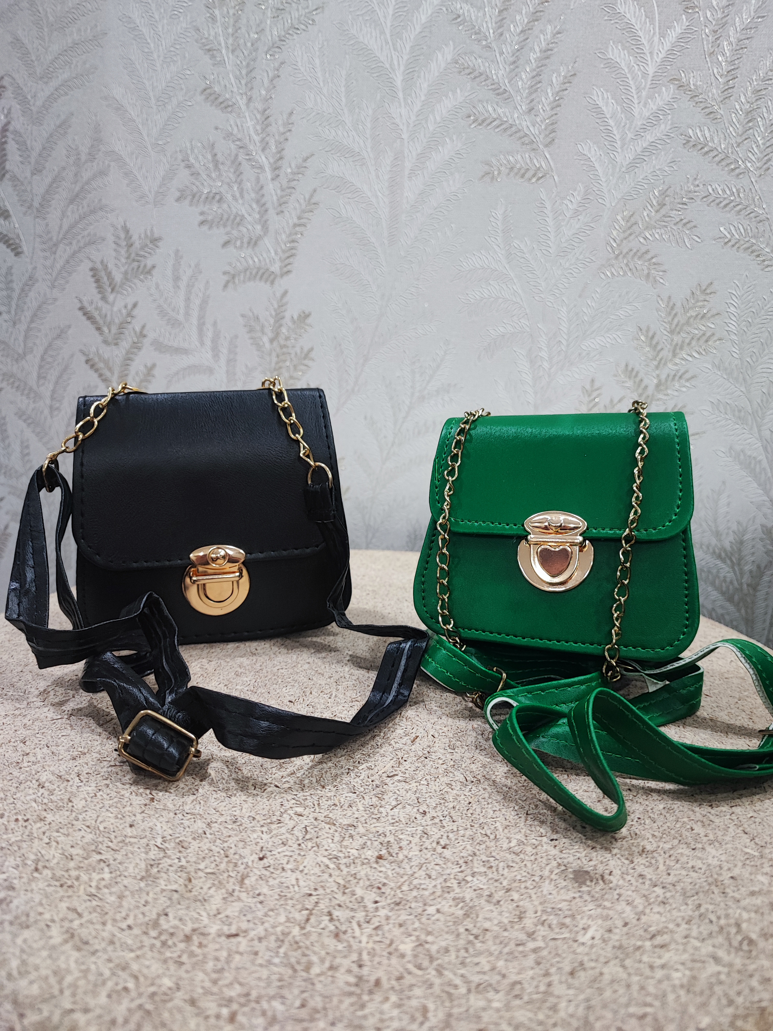کیف مینی بگ دخترانه مدل صندوقی با بند بلند زنجیری چرمی در دو رنگ سبز و مشکی