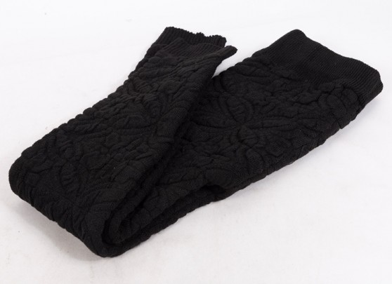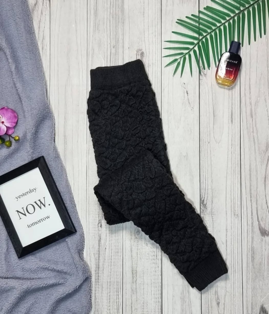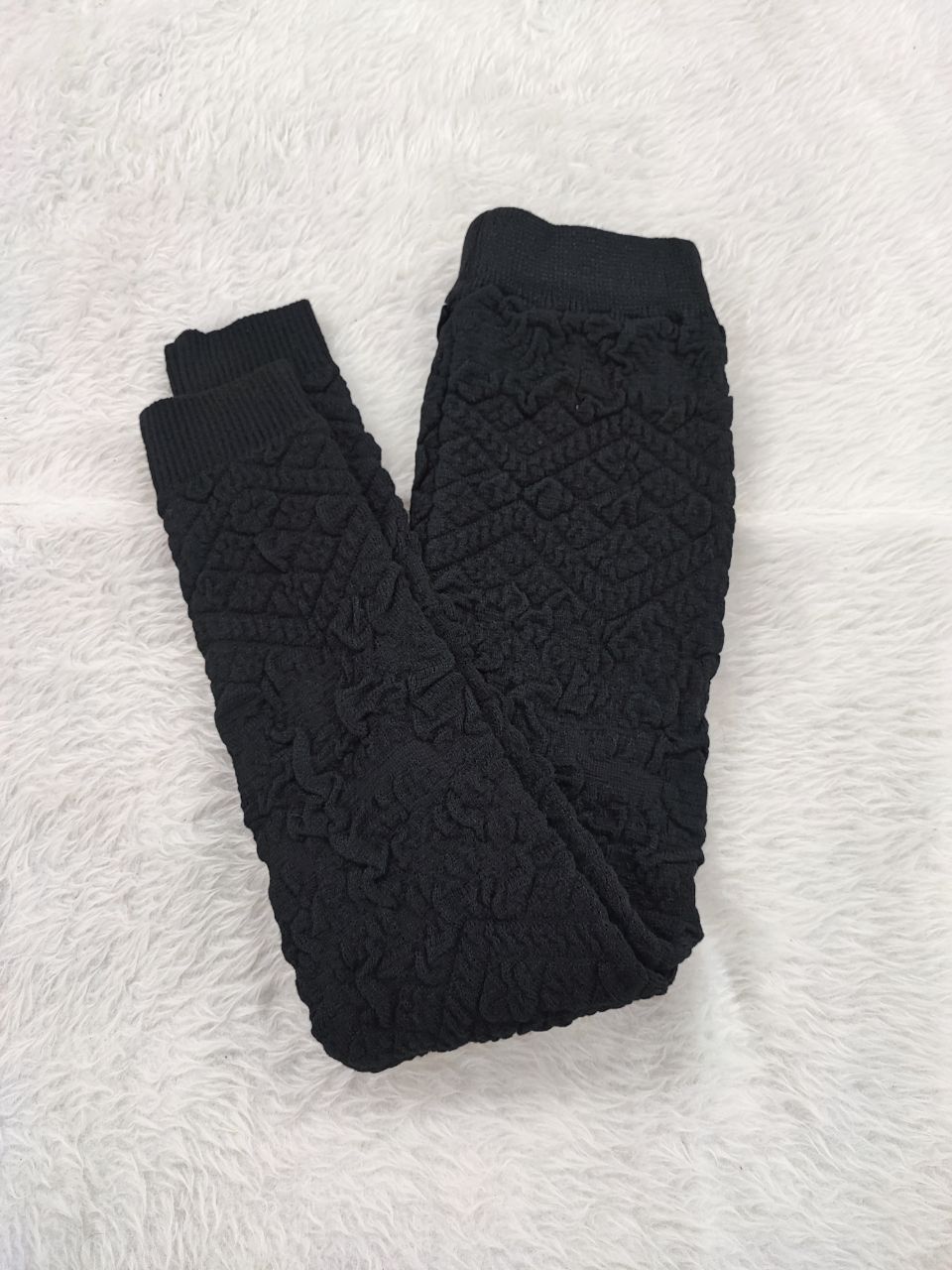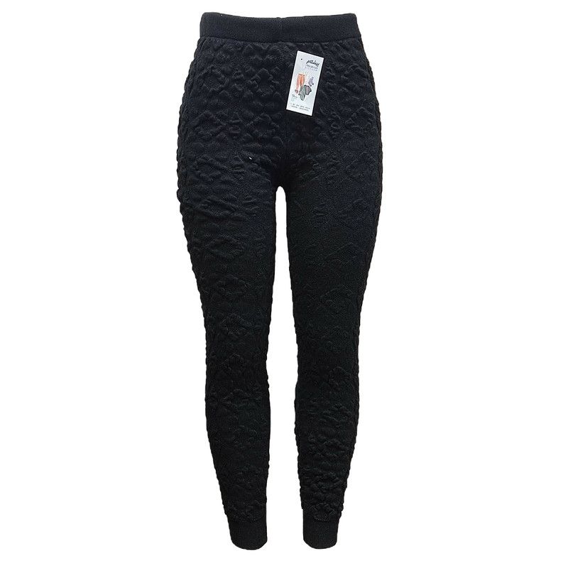 شلوار بافت مشکی سه بعدی زنانه دخترانه مناسب برای دختران ۱۰ سال به بالا تا خانم های سایز ۴۴ تک رنگ مشکی کمر گنی با بافت نرم برجسته طرح گل لاله