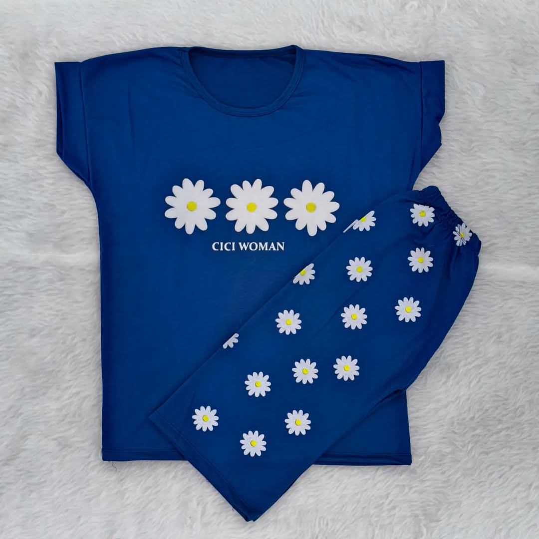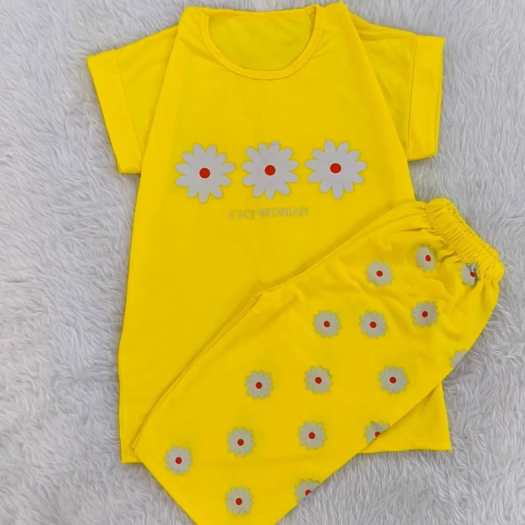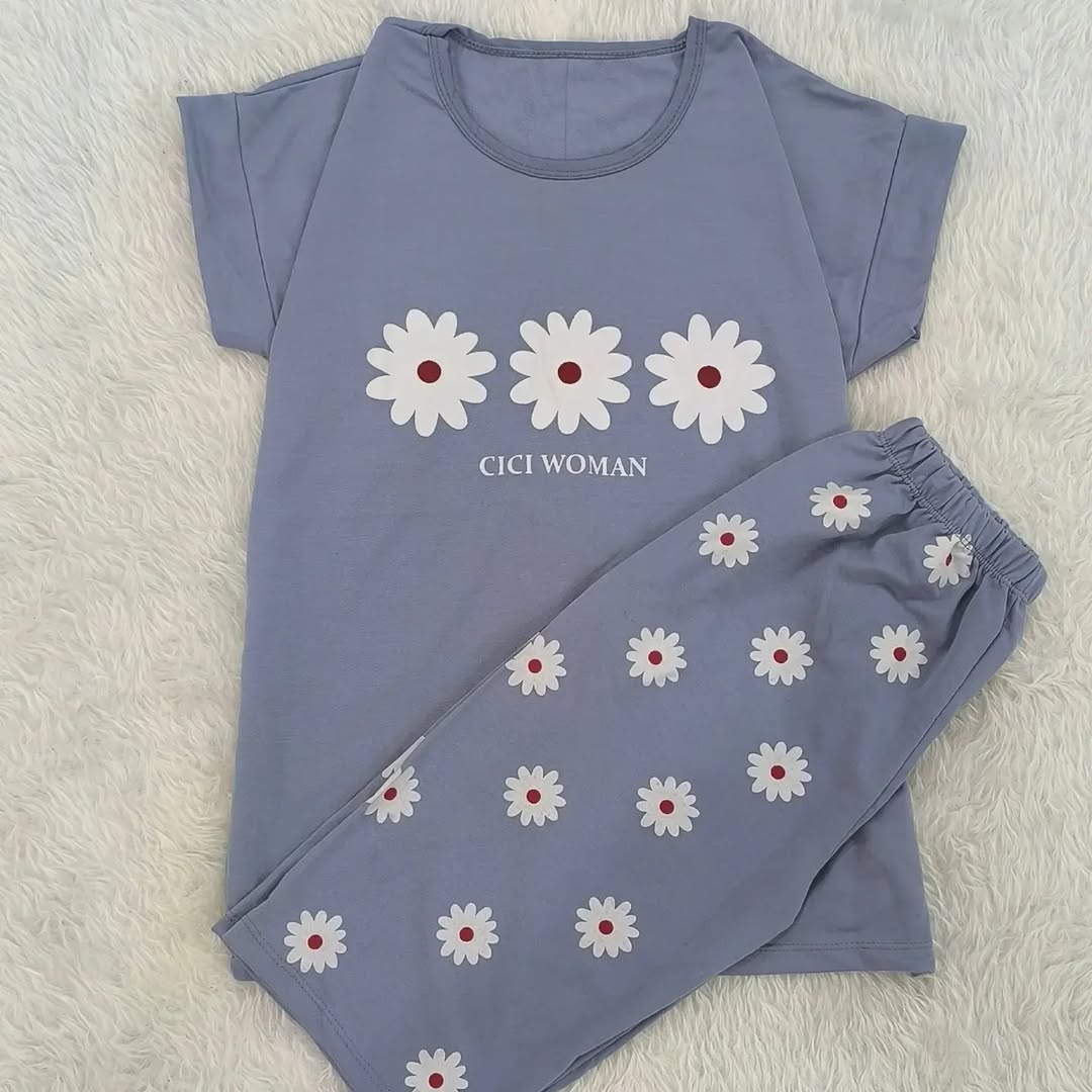 ست تیشرت شلوارک گل بابونه با جنس پنبه ویسکوز مناسب از ۱۰ سال به بالا تا سایز ۳۸ زنانه دخترانه در رنگبندی ۶ رنگ با قد تیشرت ۶۵ و شلوارک ۵۵ سانت