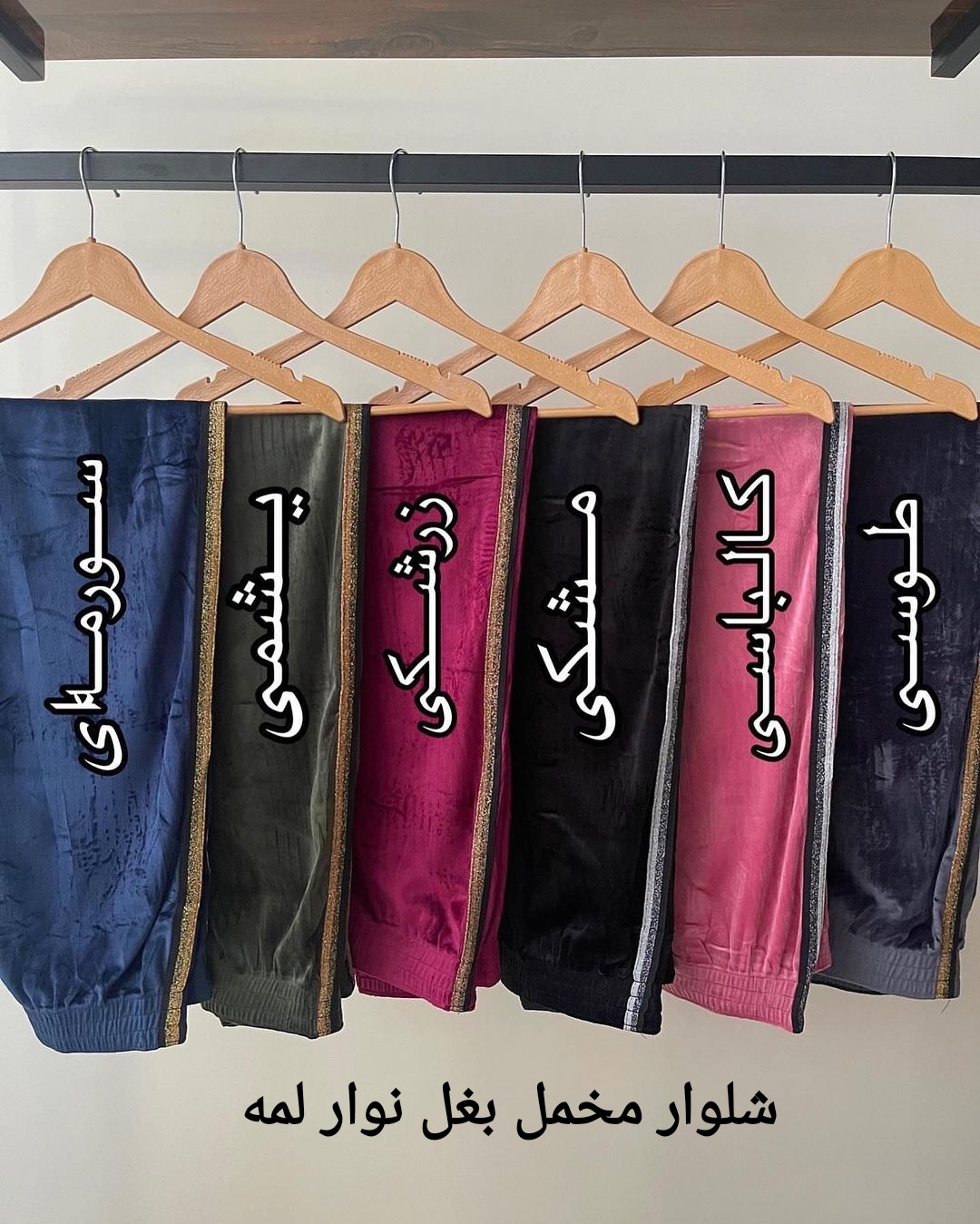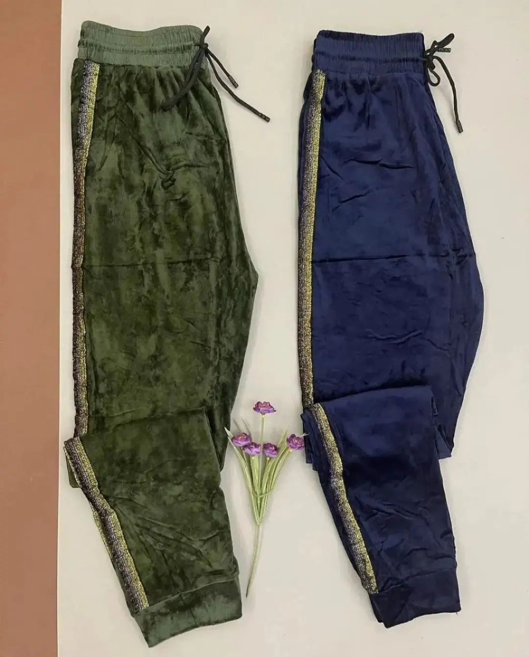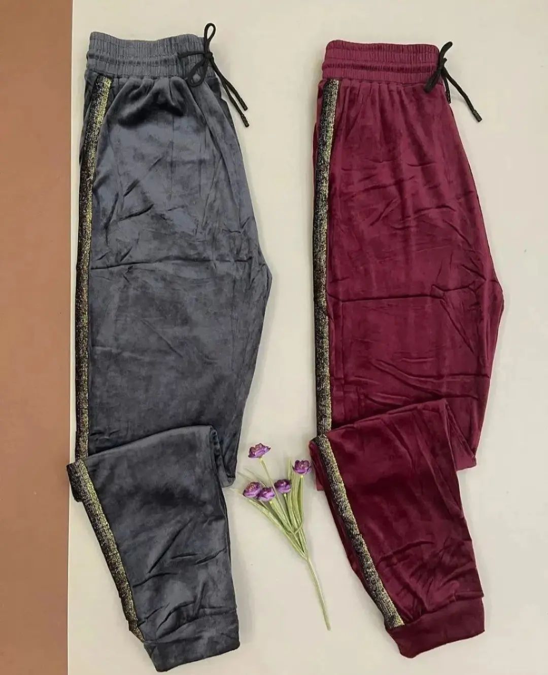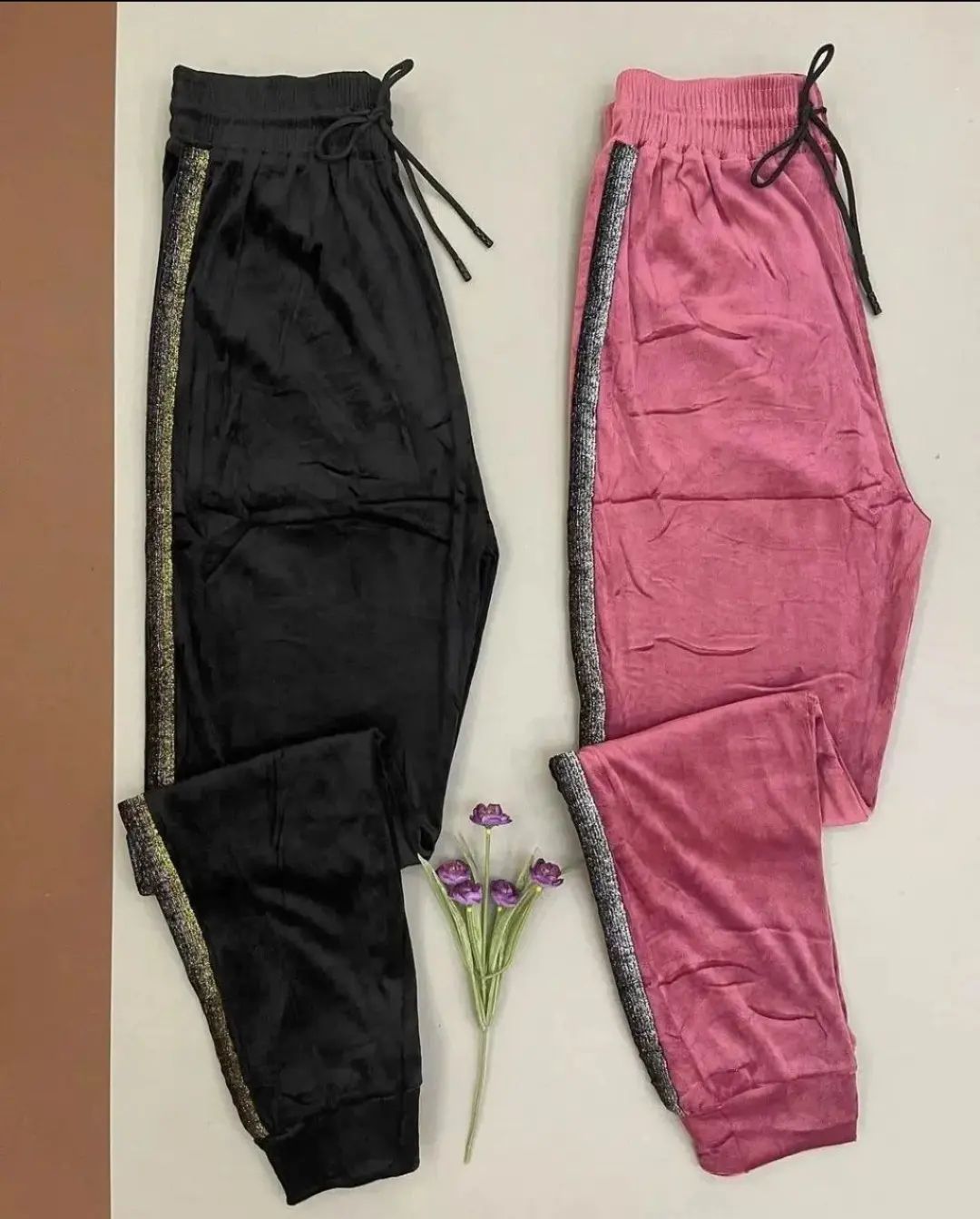 شلوار مخمل خارجی بغل نوار لمه زنانه فری تا سایز ۵۲ در ۶ رنگ زیبا در دو رنگ نوار لمه طلایی و نقره ای با قد ۱۰۰ سانت و مدل کمر کش با جنس مخمل نرم خارجی با کشسانی بالا