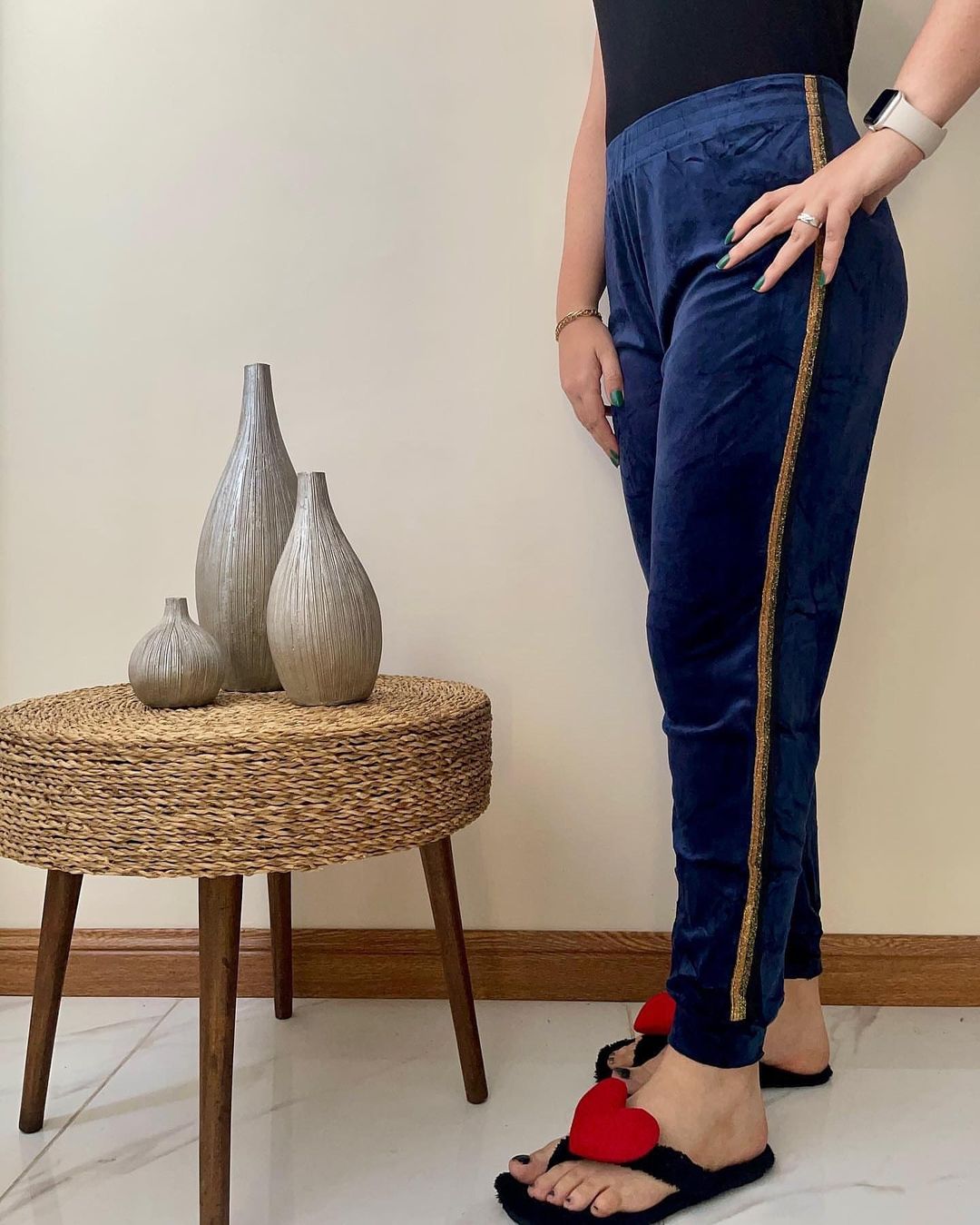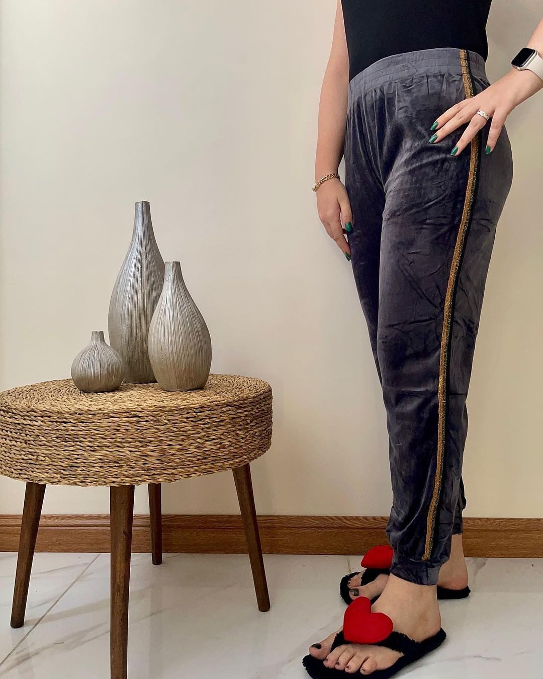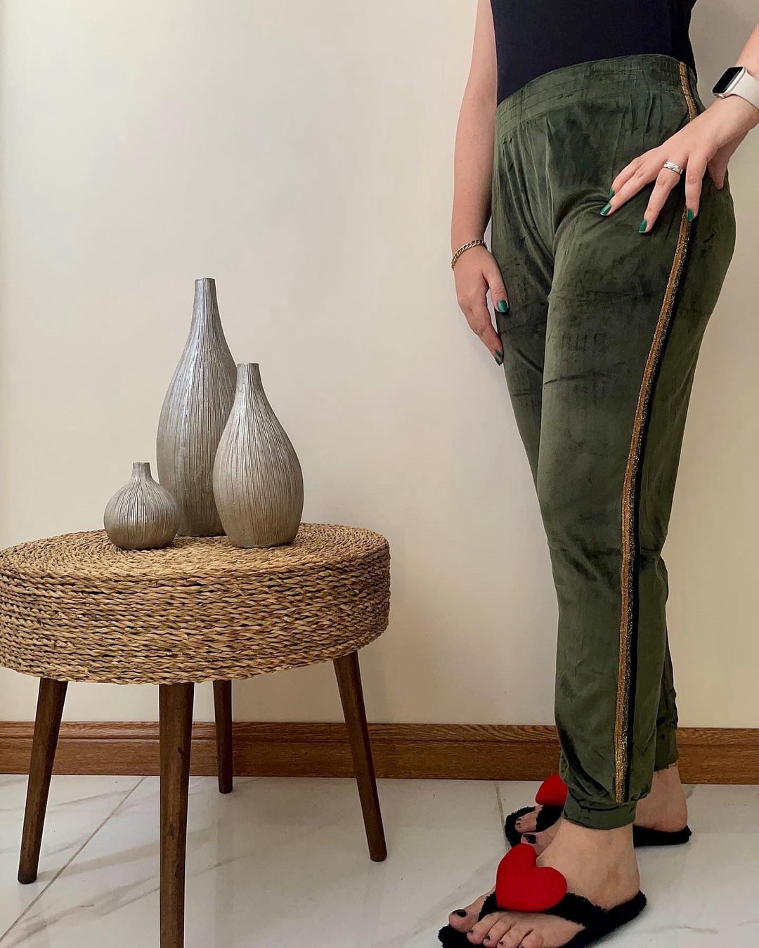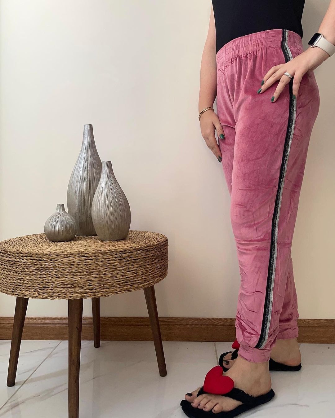 شلوار مخمل خارجی بغل نوار لمه زنانه فری تا سایز ۵۲ در ۶ رنگ زیبا در دو رنگ نوار لمه طلایی و نقره ای با قد ۱۰۰ سانت و مدل کمر کش با جنس مخمل نرم خارجی با کشسانی بالا